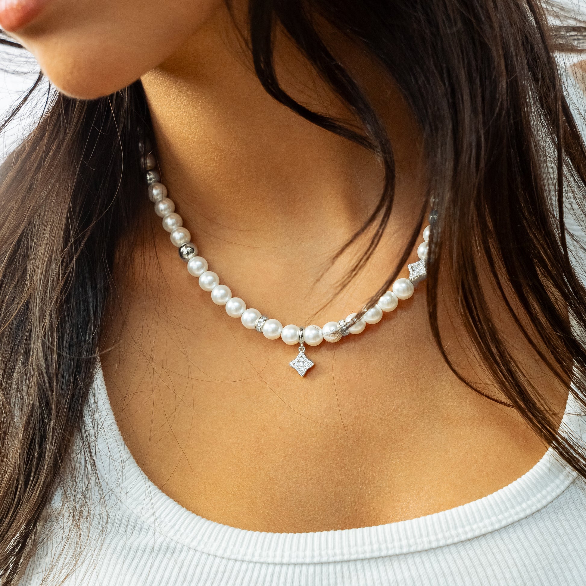 Découvrez notre chaîne Flower Pearl, une pièce raffinée qui allie la douceur des perles à l’éclat de détails floraux. Ornée de perles blanches de 8 mm, ponctuée de quelques perles argentées, cette chaîne se distingue par trois fleurs scintillantes incrustées de pierres blanches. L’une d’elles, suspendue en pendentif, vient sublimer l’ensemble avec une touche aérienne et lumineuse.