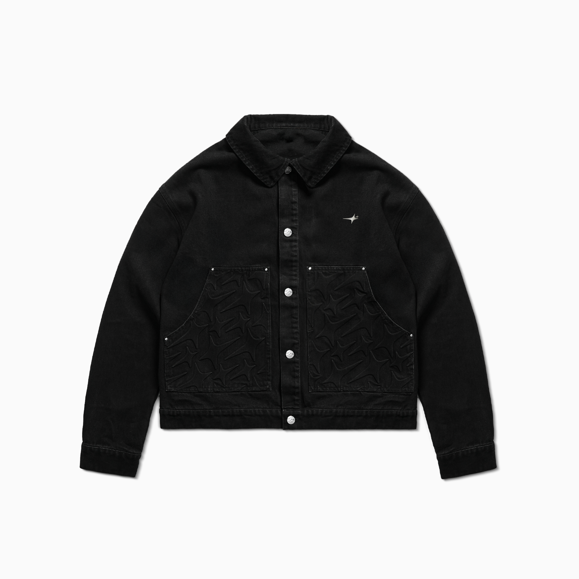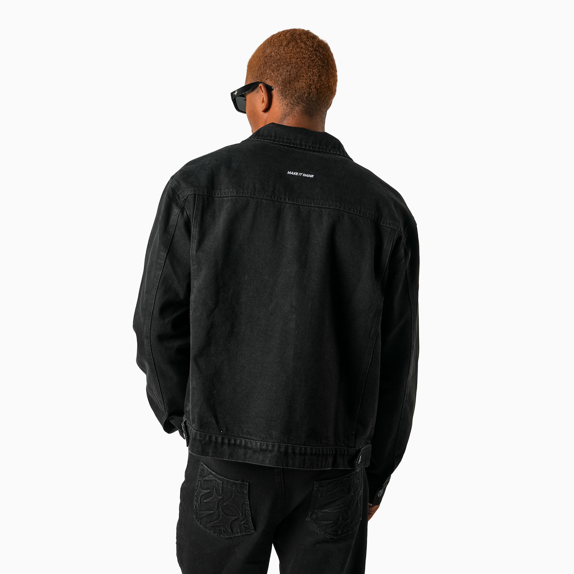 Veste en denim noir à manches longues avec une coupe droite. Monogramme embossé en relief sur les poches avant. Col structuré, fermeture boutonnée avec boutons métalliques argentés. Logo métallique Make It Shine sur la poitrine. “Make It Shine” brodé en blanc au dos.
