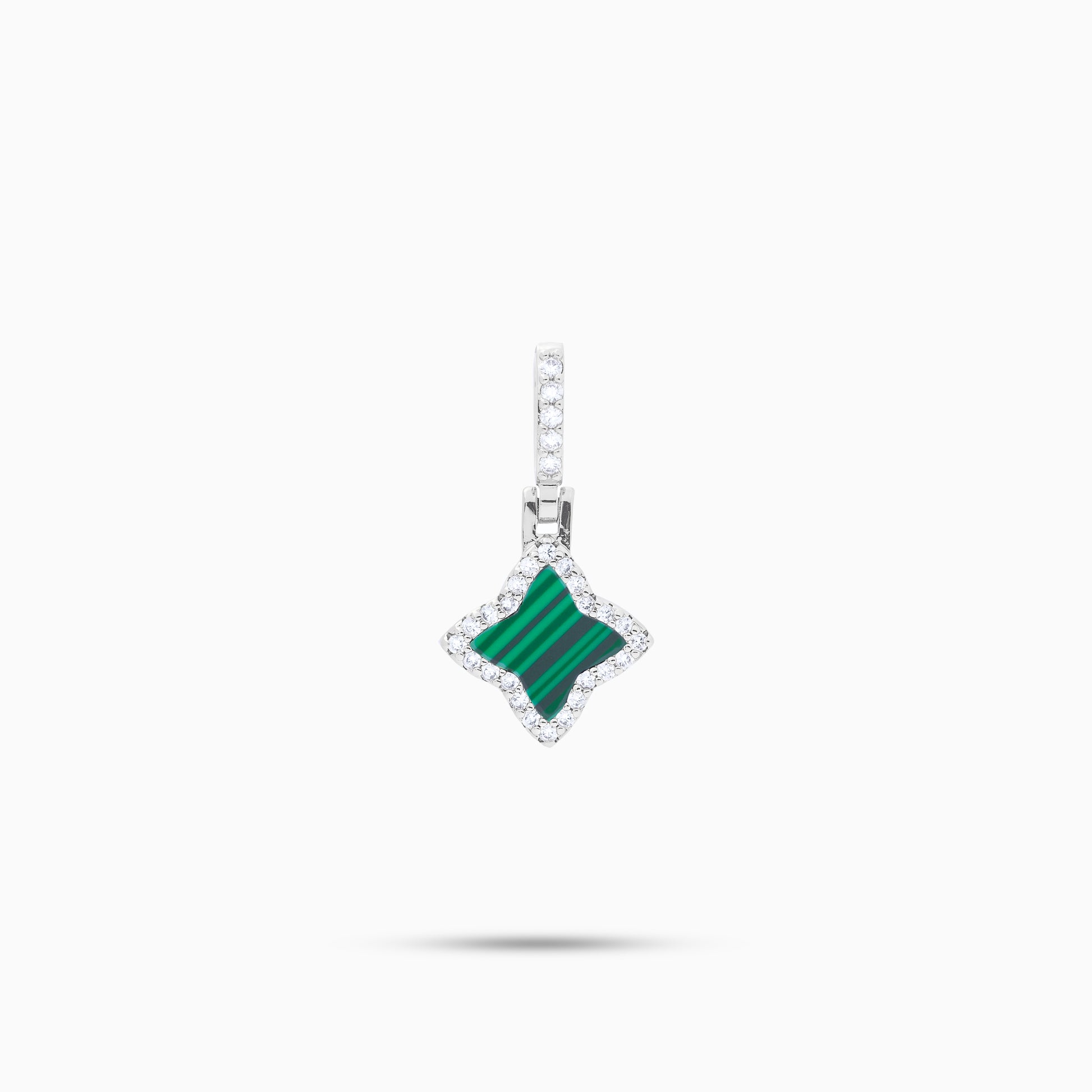 Voici notre pendentif Flower, alliant délicatesse et raffinement intemporel. Au cœur de ce bijou, une fleur sertie de pierres scintillantes met en valeur une pierre centrale en imitation malachite, le tout offrant une épaisseur de 8 mm pour un charme subtil et lumineux.