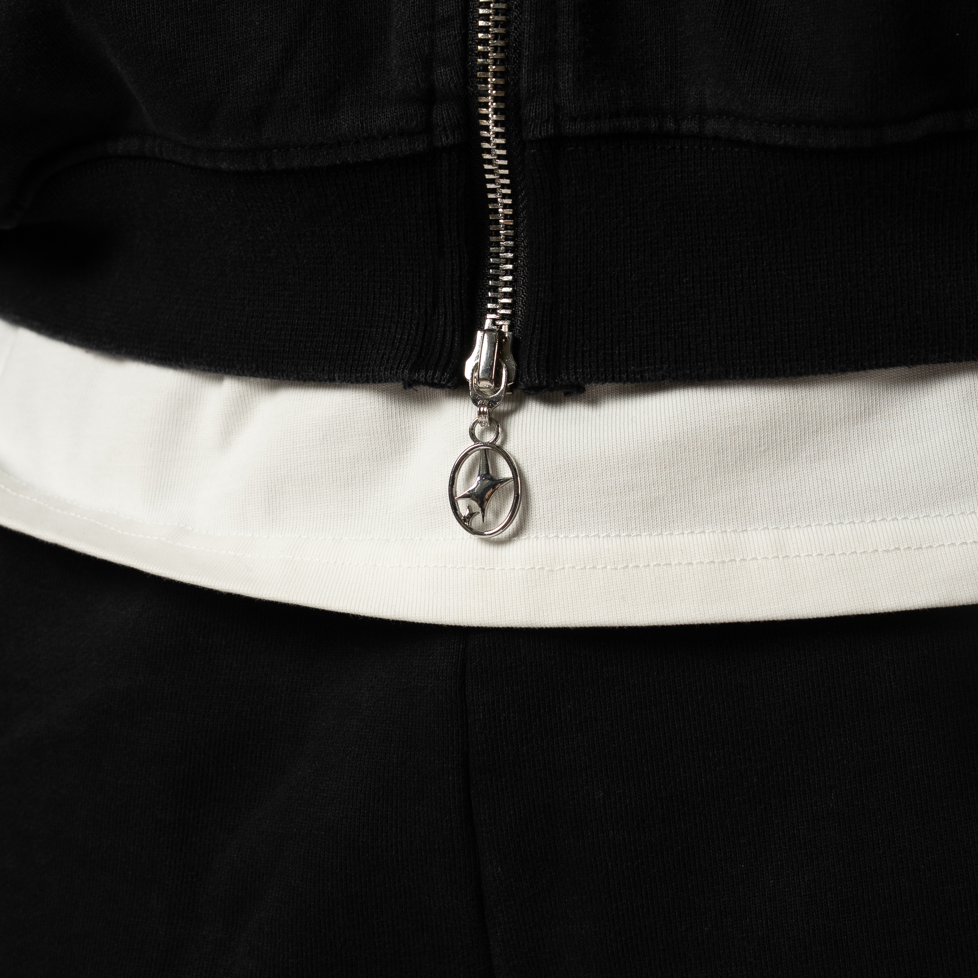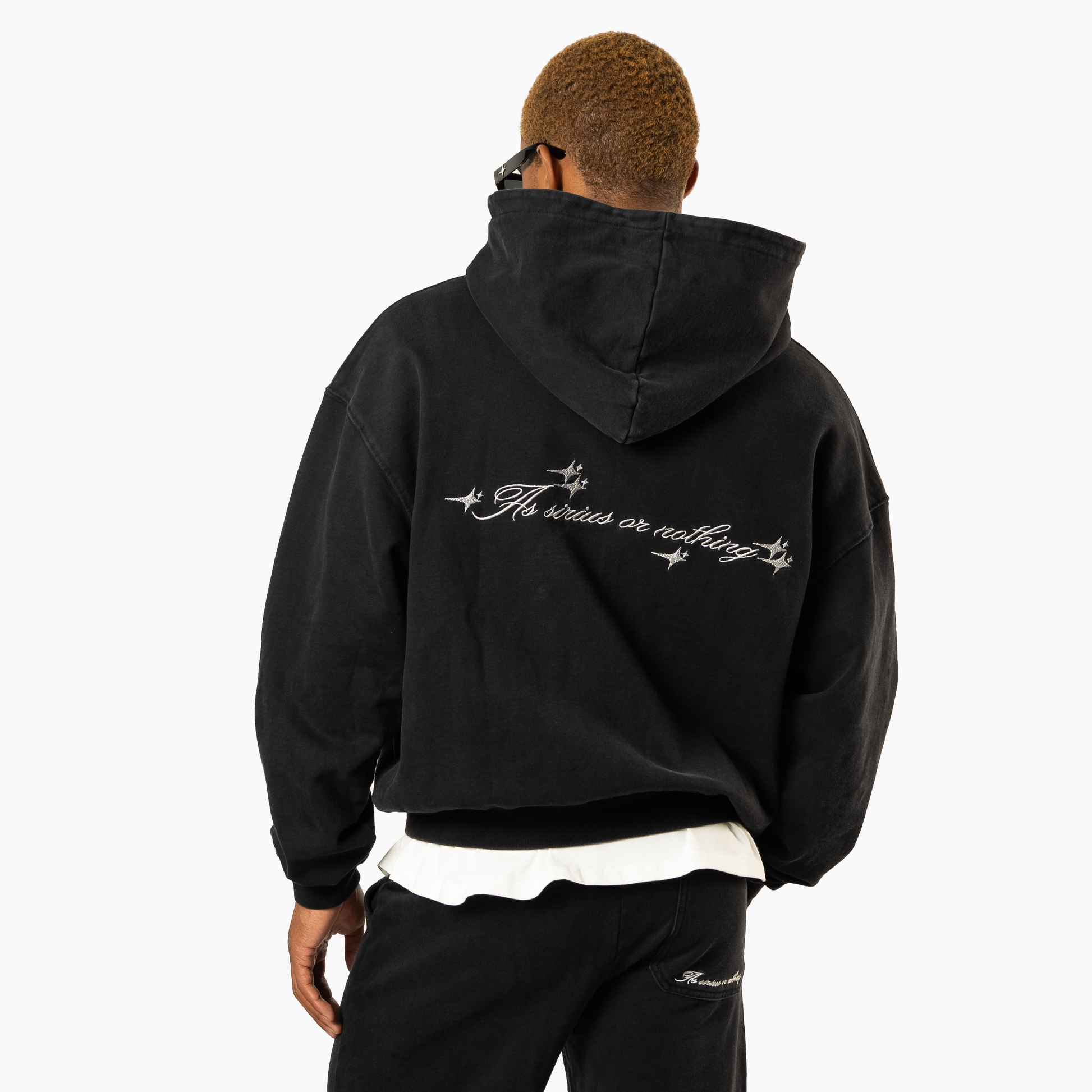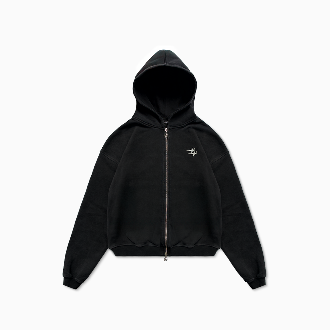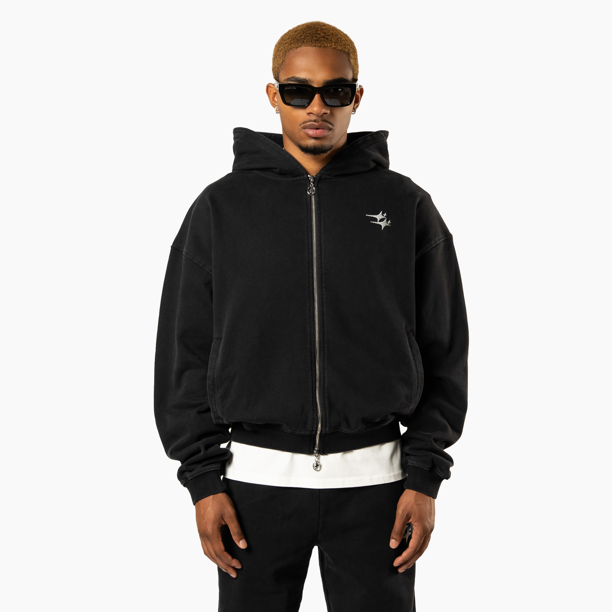 Gilet à capuche noir délavé à manches longues avec une coupe oversize, fabriqué à partir d'un coton épais de qualité supérieure. Capuche doublée et fermeture zippée sur le devant, complété par deux poches latérales.