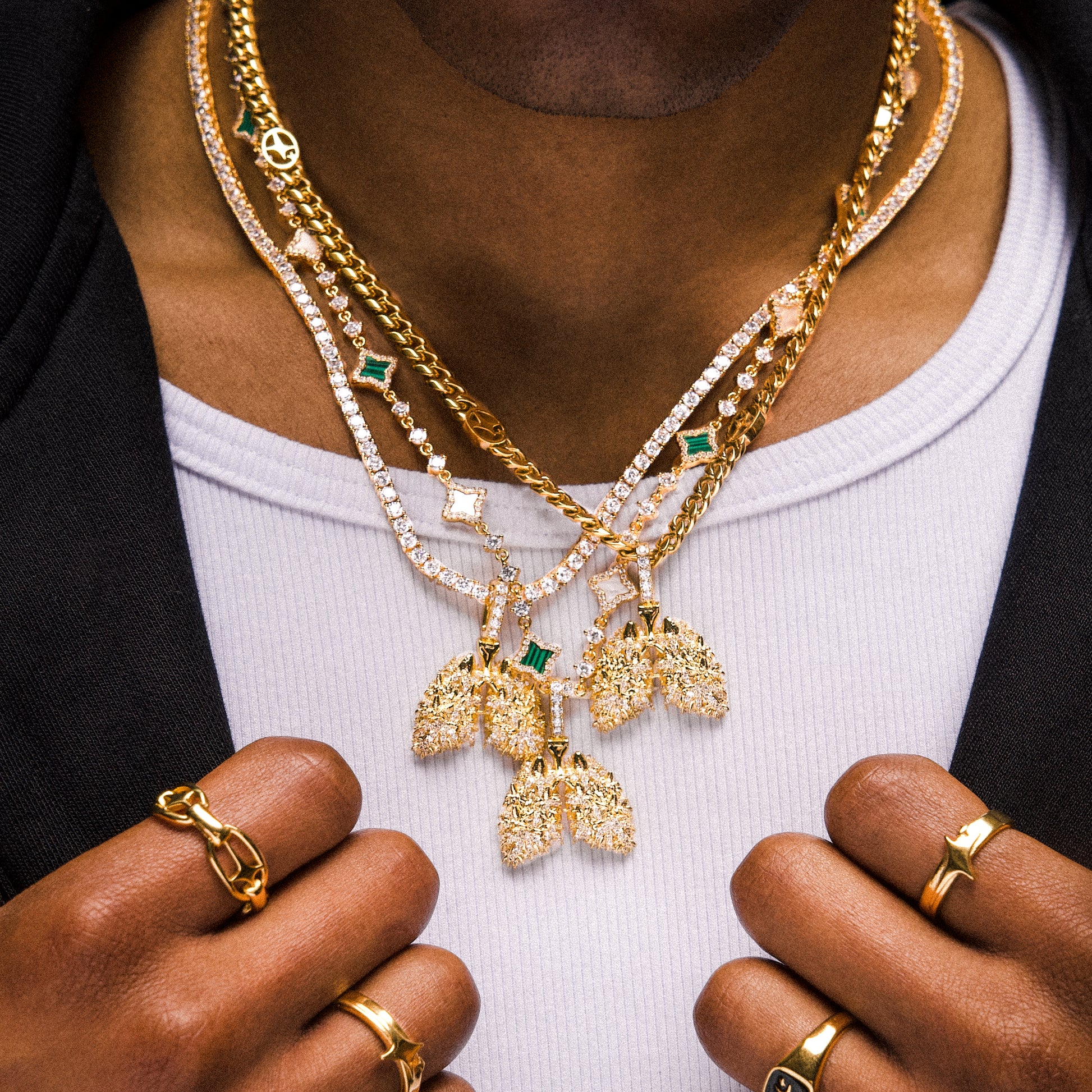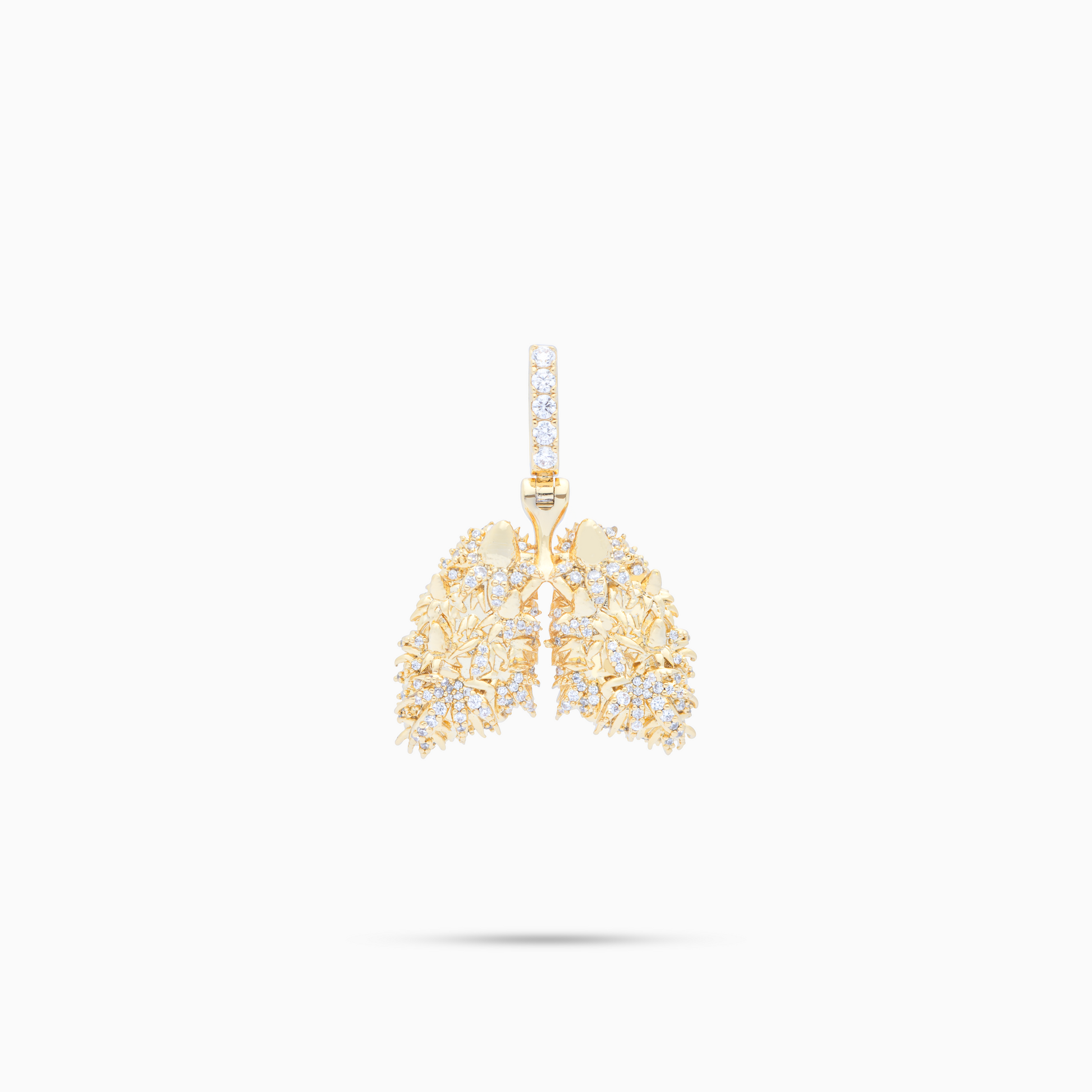 Découvrez notre pendentif exclusif Poumon d'Or, une création emblématique réalisée en collaboration avec High & Fines Herbes. Ce bijou unique illustre des poumons magnifiquement travaillés, ornés de feuilles de cannabis finement sculptées et sublimés par des oxydes de zirconium scintillants.