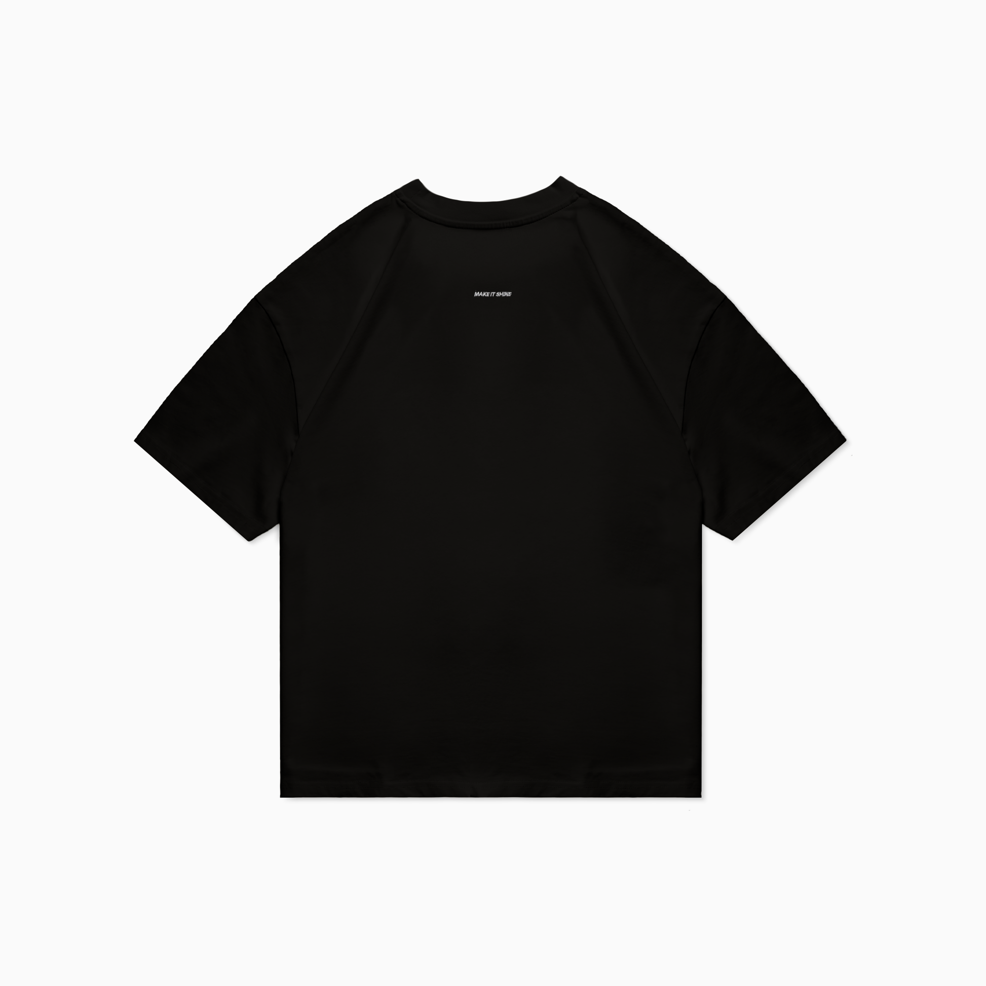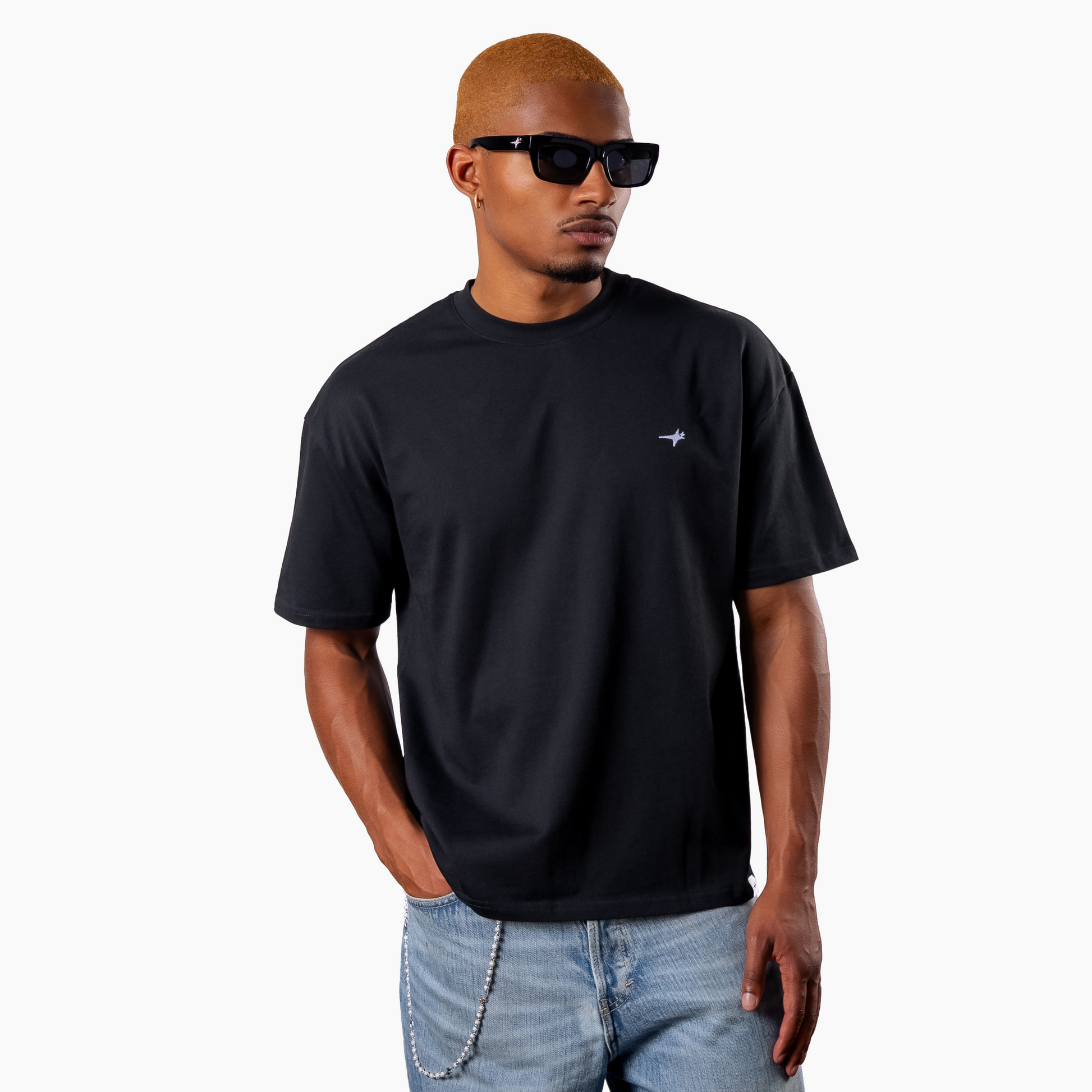 T-shirt noir en jersey à manches courtes avec une coupe oversize, confectionné en coton épais. Col ras de cou côtelé.