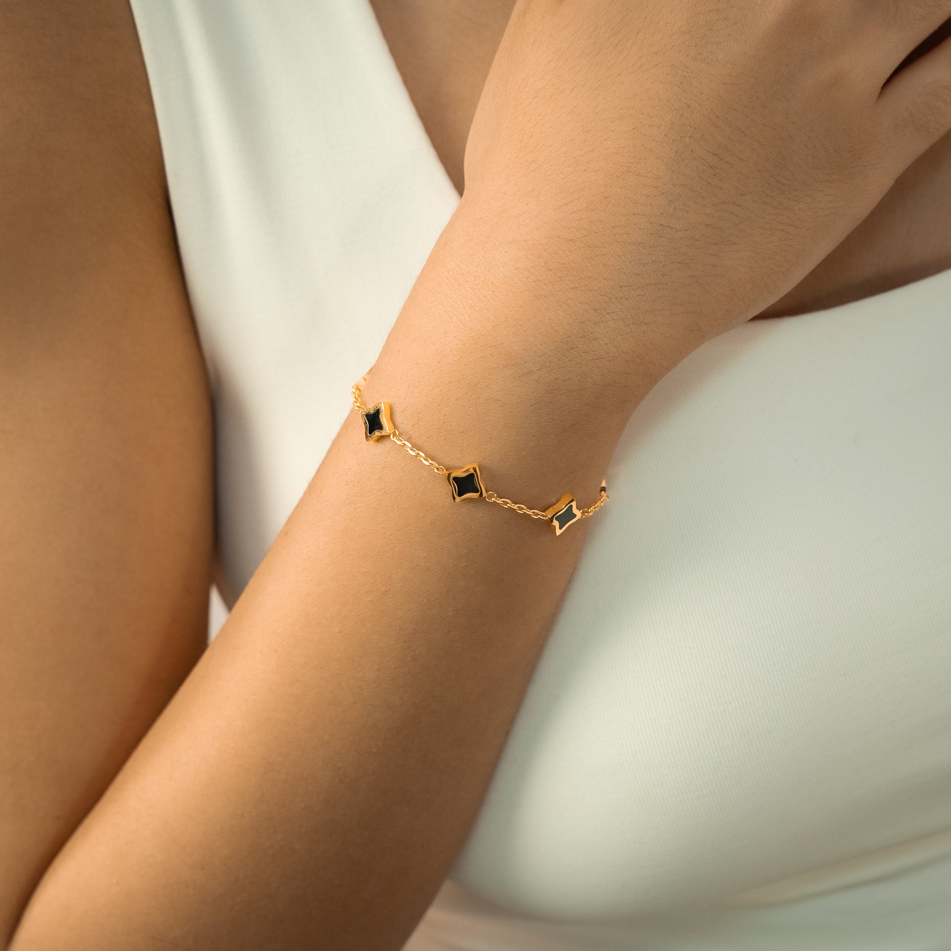 Discover our Flower Bracelet, an exquisite piece that combines the timeless elegance of a cable chain with the delicacy of flowers. Each flower, adorned with a Onyx imitation stone and measuring 8mm in thickness, adds a touch of charm and sophistication to this 2mm chain.
