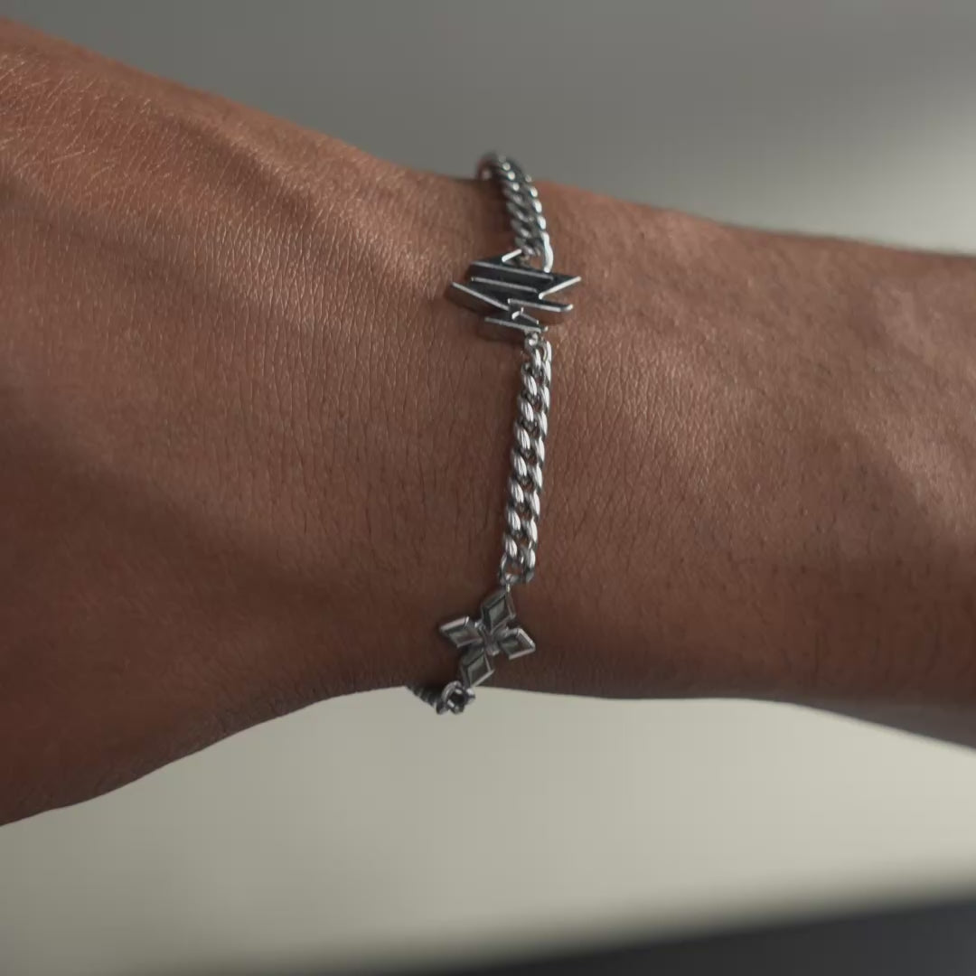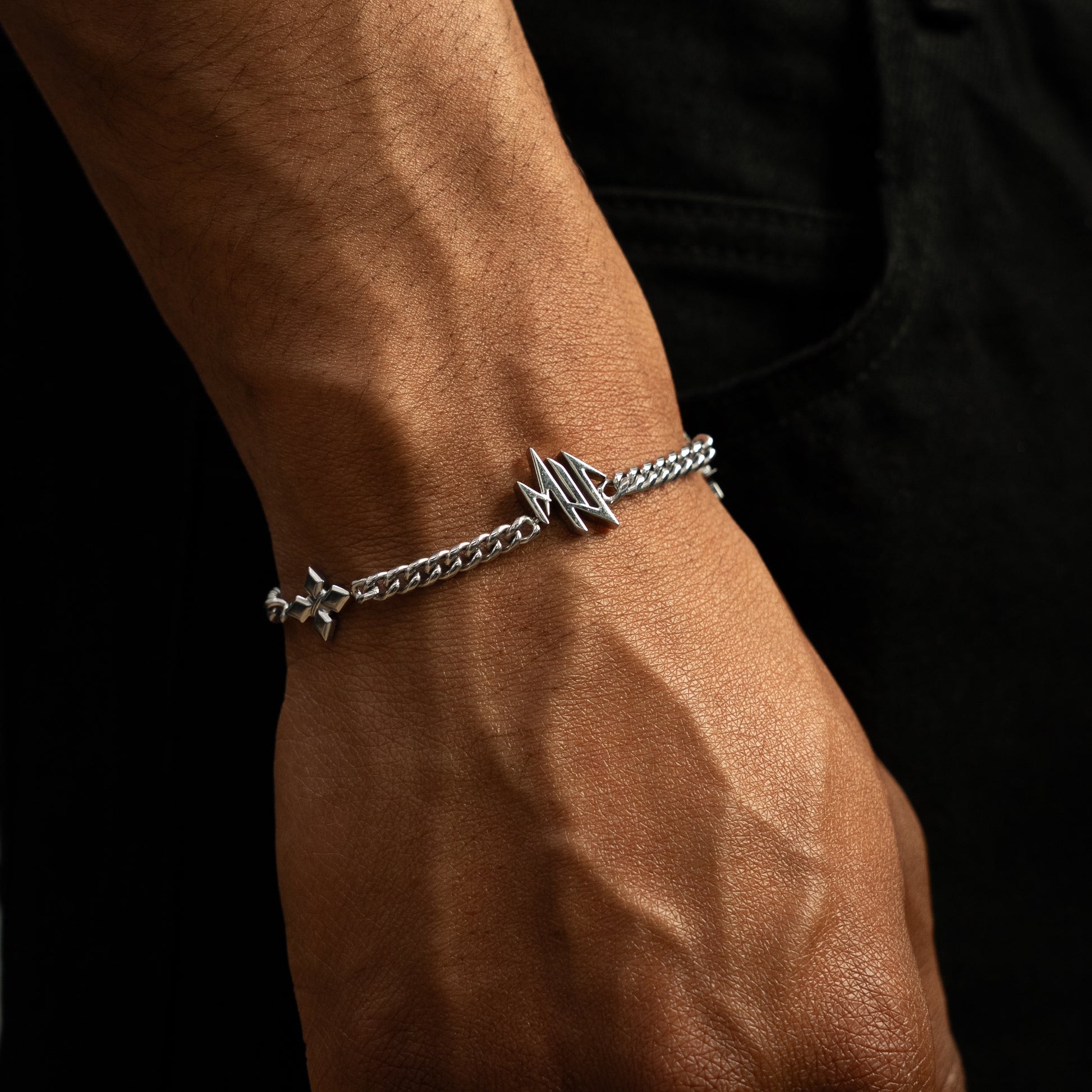The MIS Cuban Bracelet combines three iconic Make It Shine symbols: the star-spangled cross, the double star logo, and the MIS logo.