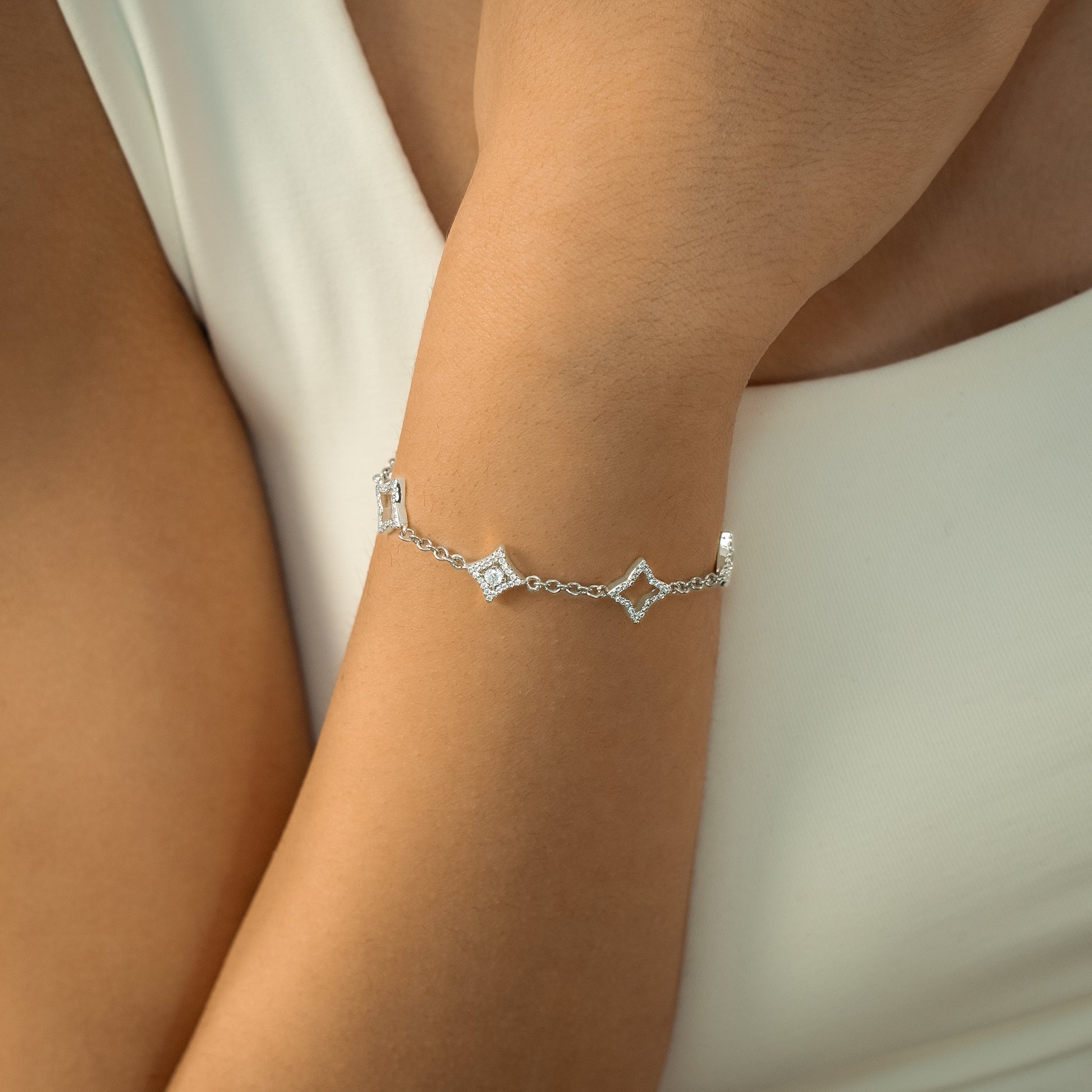 Introducing our Mixed Star & Flower Bracelet, an elegant blend of sparkling stars and delicate flowers. Each star, adorned with a sparkling stone, illuminates this 3mm cable chain. The hollow flowers, embellished with sparkling stones, strike the perfect balance between sparkle and sophistication.