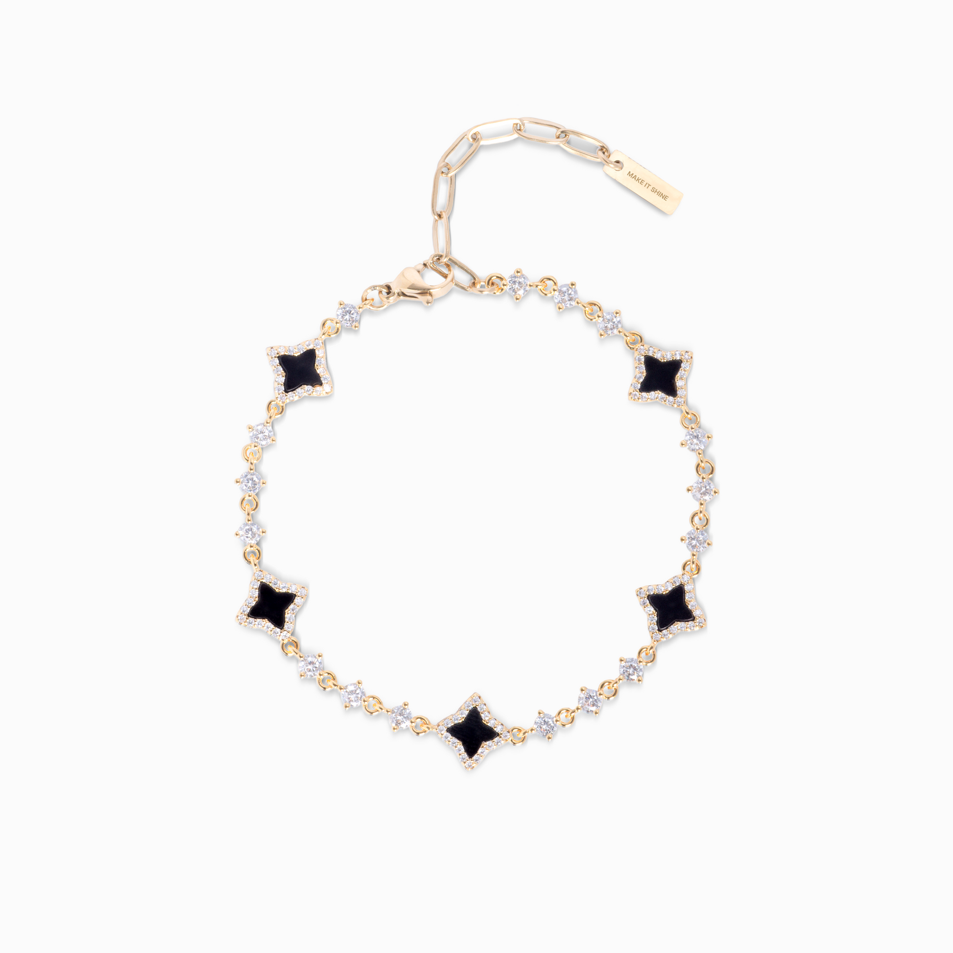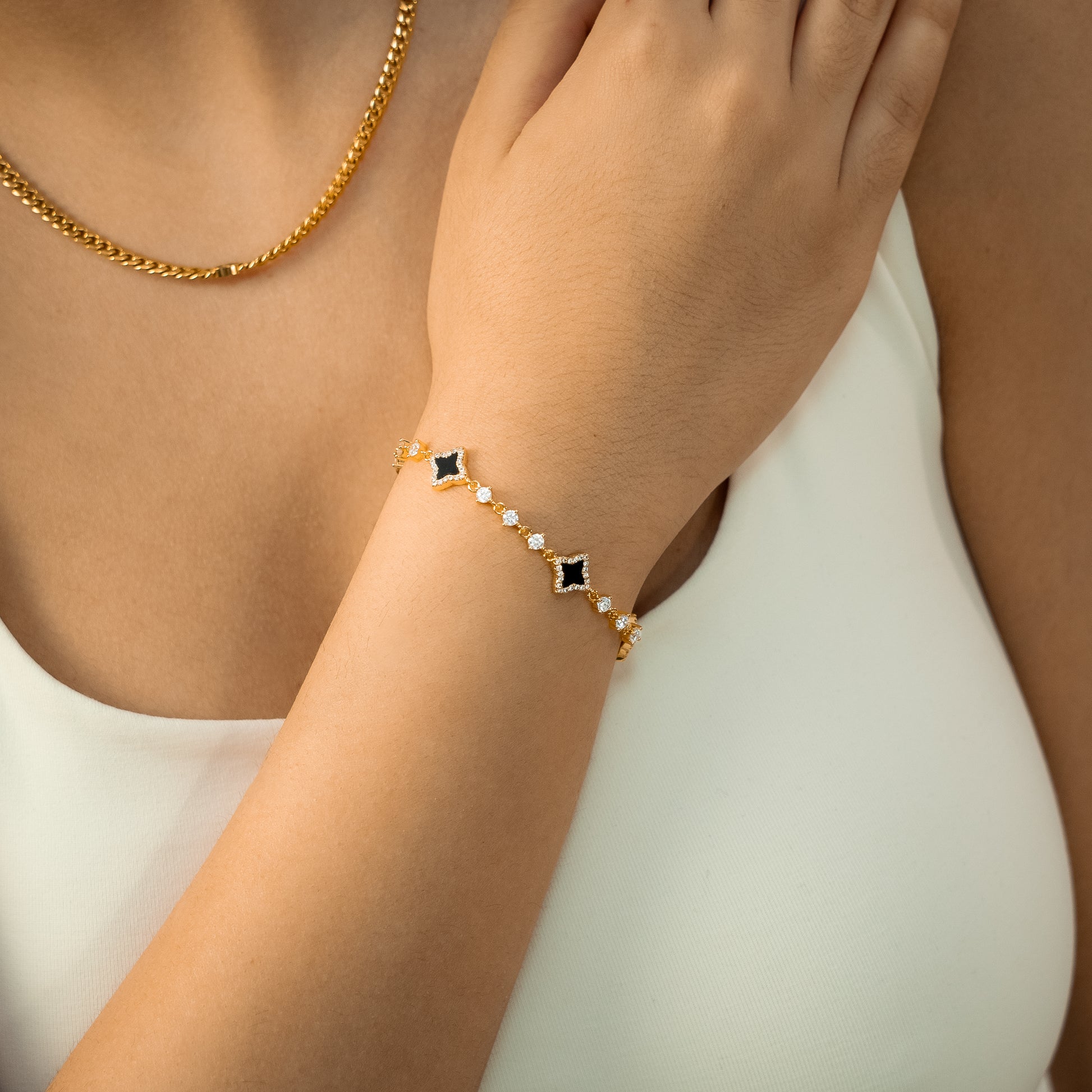 Discover our Flower Tennis Bracelet, an exquisite piece that combines the timeless elegance of the tennis bracelet and the delicacy of flowers. Each of the flowers, decorated with an imitation onyx stone and measuring 8 mm thick, adds a touch of charm and sophistication to this 3 mm bracelet.