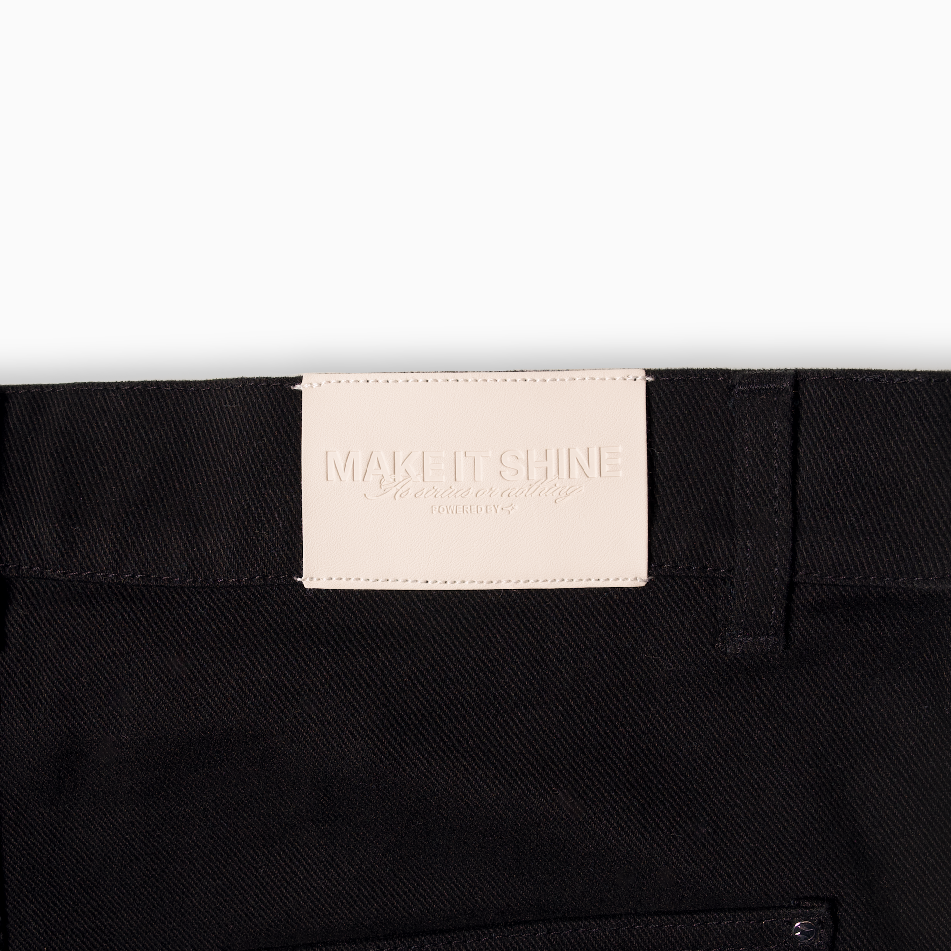 Meet our Carpenter Denim Make it Shine, a loose-fit denim pant designed for comfort and style. Made from 100% cotton, it features black embroidered logos on the front and back, as well as a "Make it Shine" embroidery on the back pocket for a distinctive touch. Custom metal hardware and a logo-engraved button closure add a touch of understated luxury to this must-have piece.