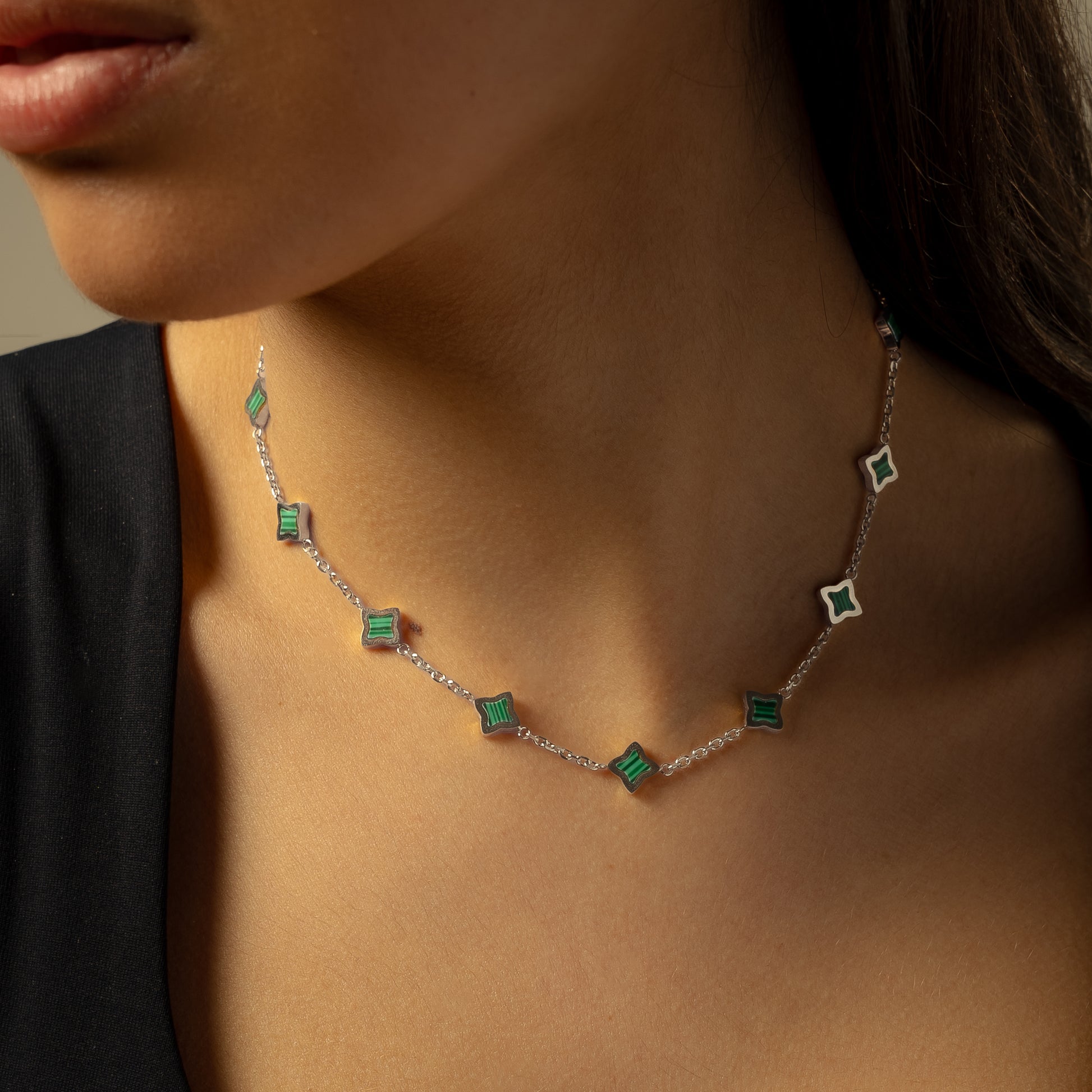 Discover our Flower Chain, an exquisite piece that combines the timeless elegance of a cable chain with the delicacy of flowers. Each flower, adorned with a malachyte imitation stone and measuring 8mm in thickness, adds a touch of charm and sophistication to this 2mm chain.