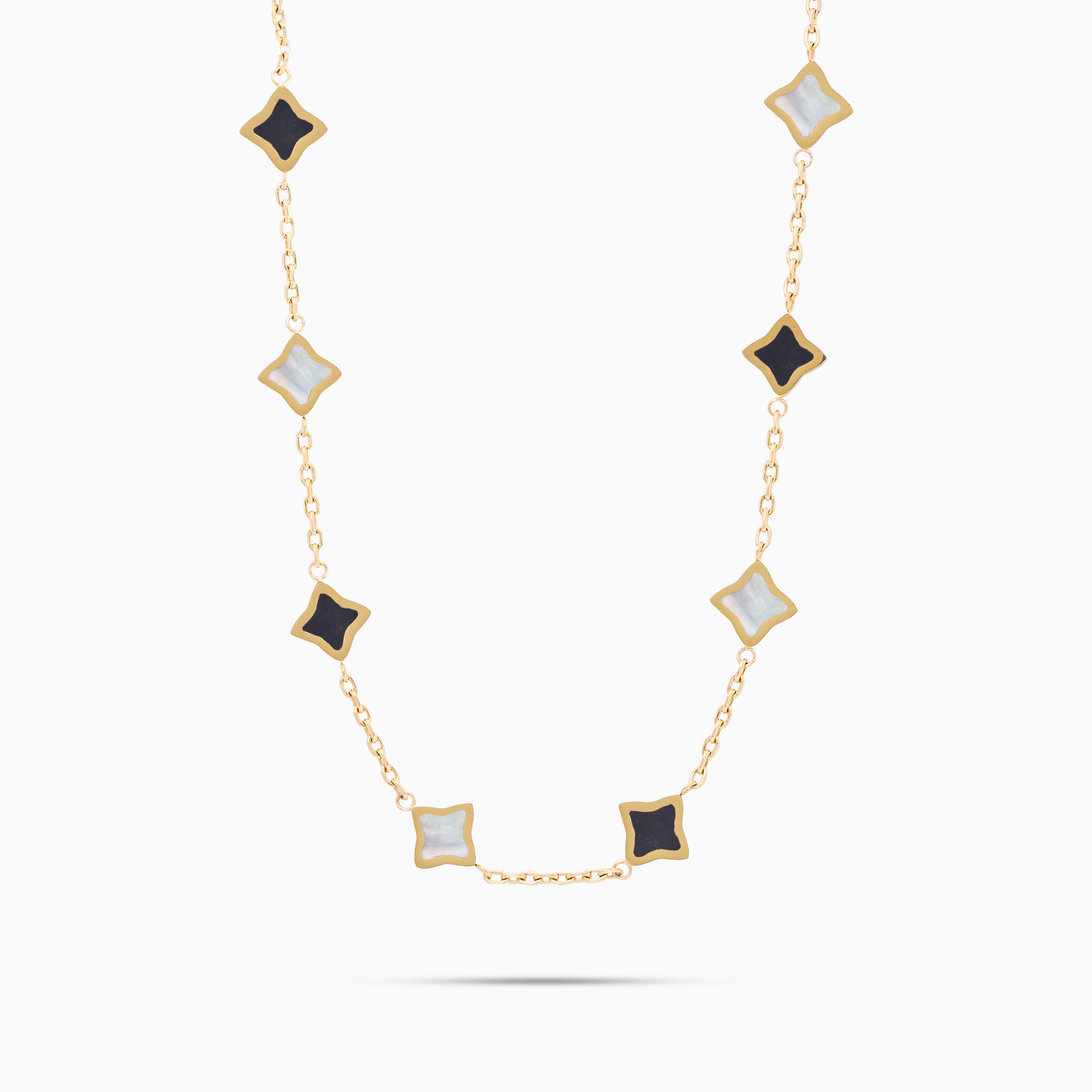 Discover our Flower Chain, an exquisite piece that combines the timeless elegance of a cable chain with the delicate beauty of flowers. Each flower, adorned with a mother-of-pearl or onyx imitation stone and 8 mm thick, adds a touch of charm and sophistication to this 2 mm chain.