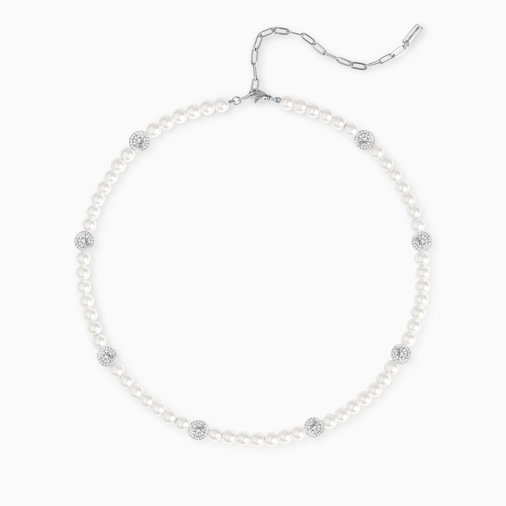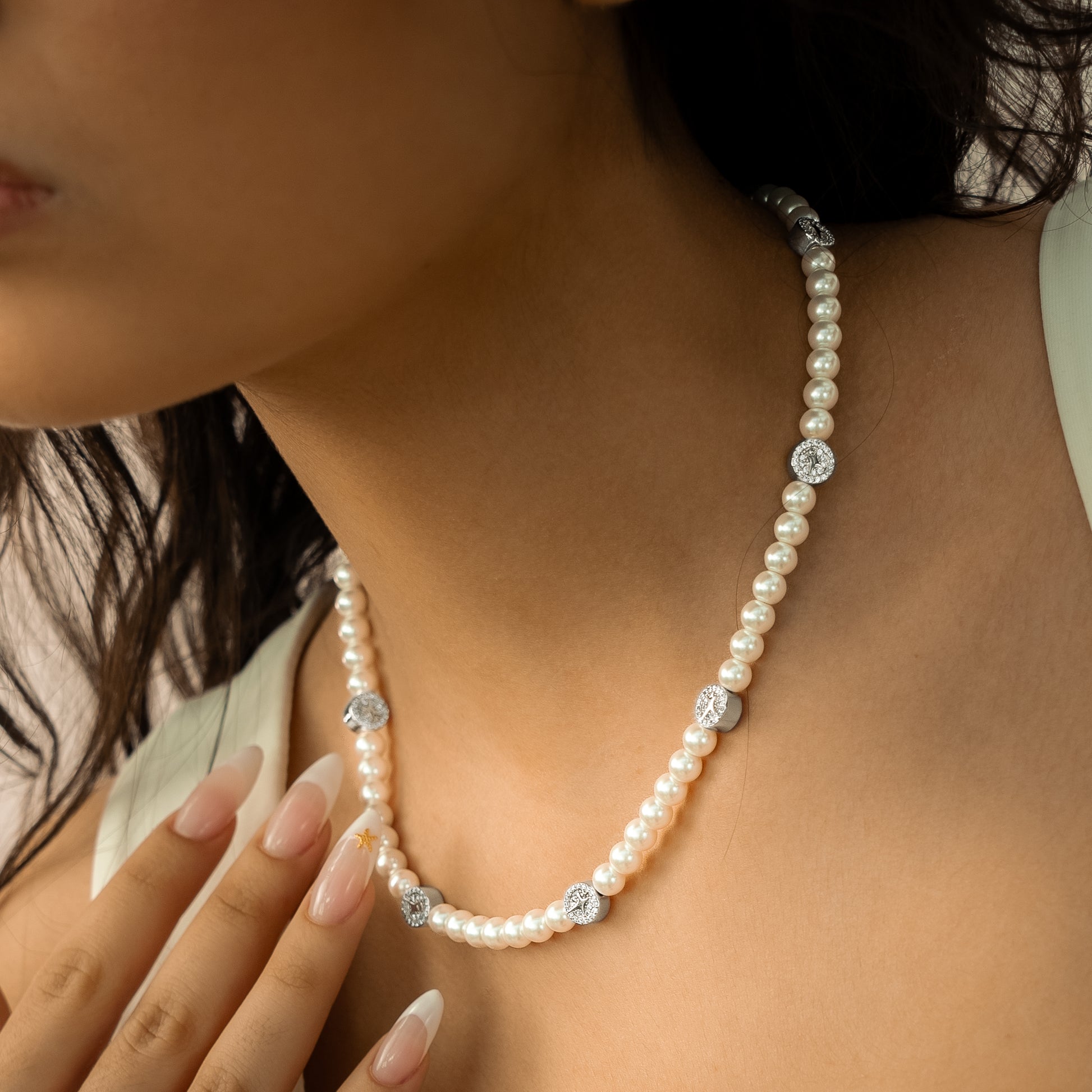 Discover our Monogram Pearl chain, an elegant and sophisticated piece of jewelry that will not go unnoticed. Designed with meticulous attention to detail, this chain features 6mm Pearl as well as finely crafted elements, each adorned with sparkling stones and our distinctive monogram.
