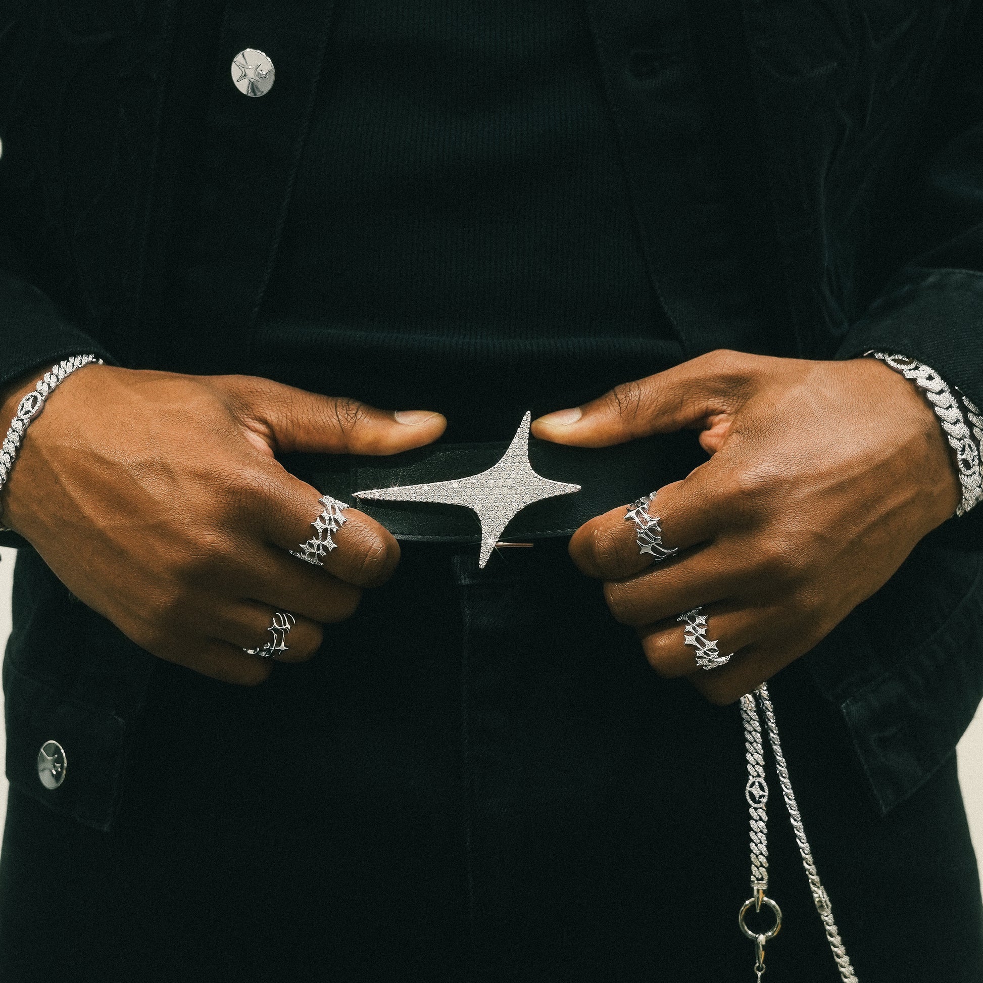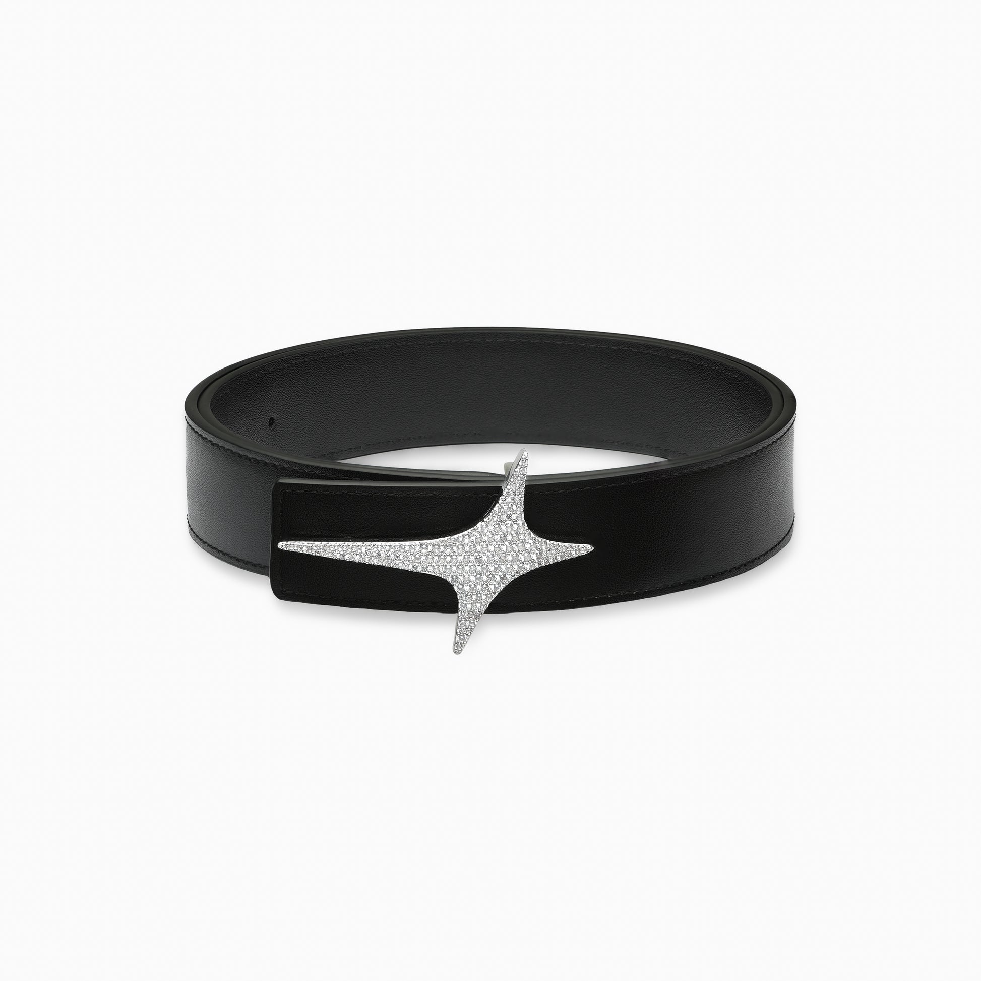 Genuine black leather belt. Silver-tone metal Make it Shine logo buckle, adorned with zirconia. Shiny finish and intricate details for a bold style. On the back, tone-on-tone debossed “As Sirius or Nothing” inscription.