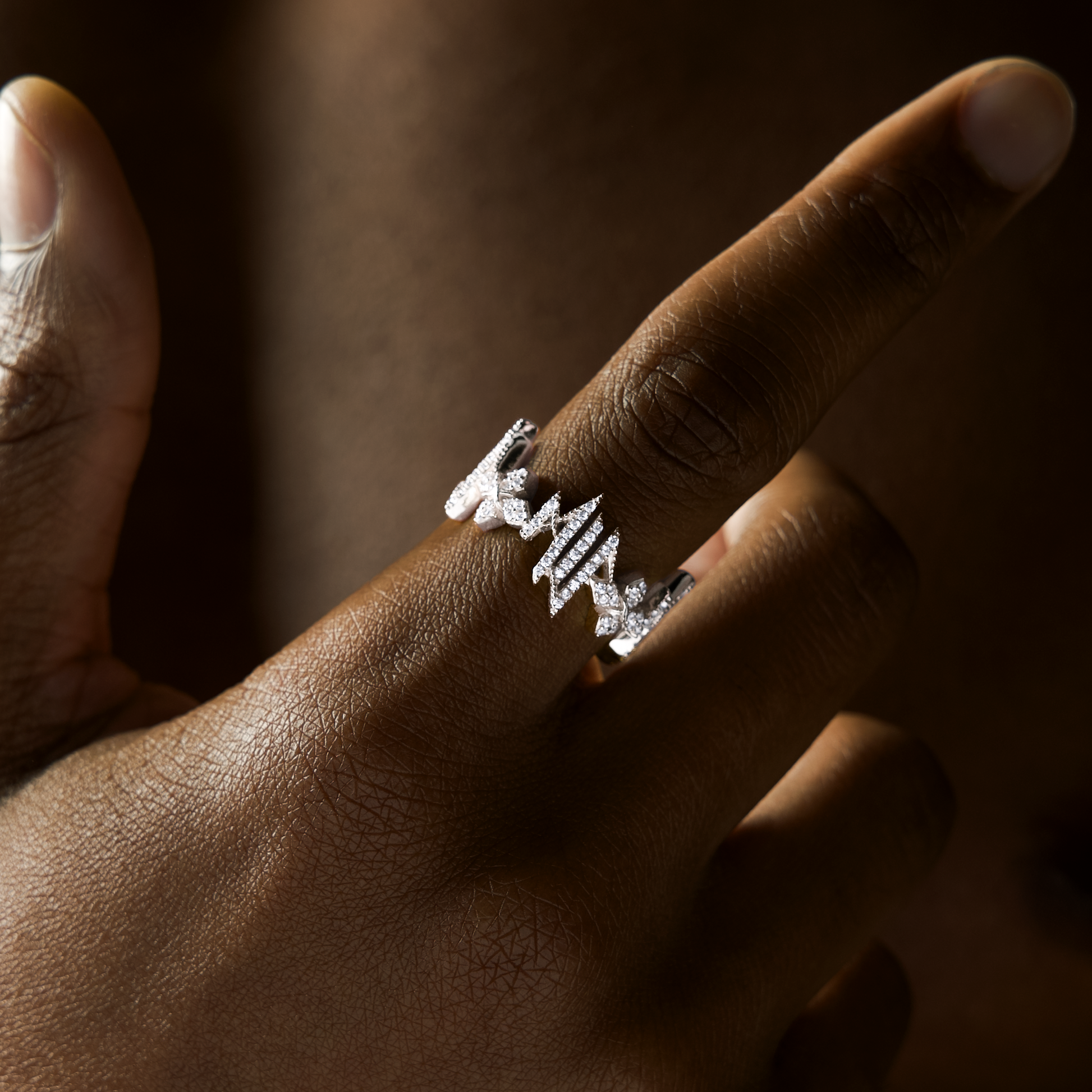 Set with zirconium oxides, they complement each other to symbolize strength, light and resilience.