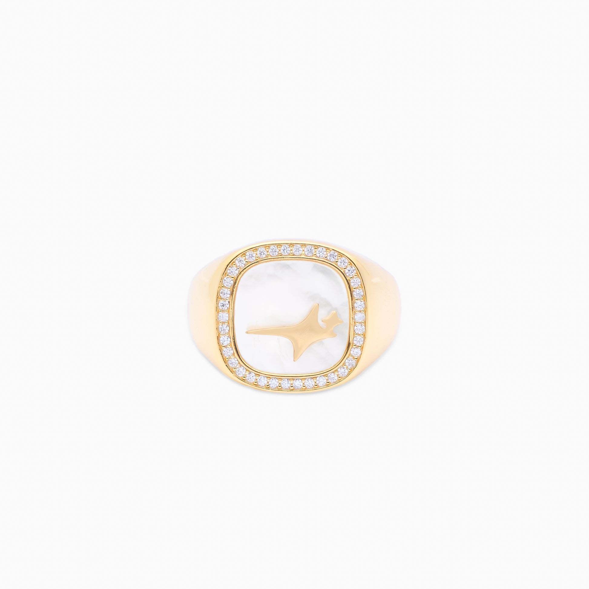 Discover our Raw Ring , a signet ring with a bold and refined design, highlighted by a large 15 mm square plate. Its center, adorned with an imitation mother-of-pearl stone, contrasts delicately with the embossed Make it Shine logo. The whole is delicately encircled with white zirconium oxides, bringing a discreet but sophisticated touch of sparkle.