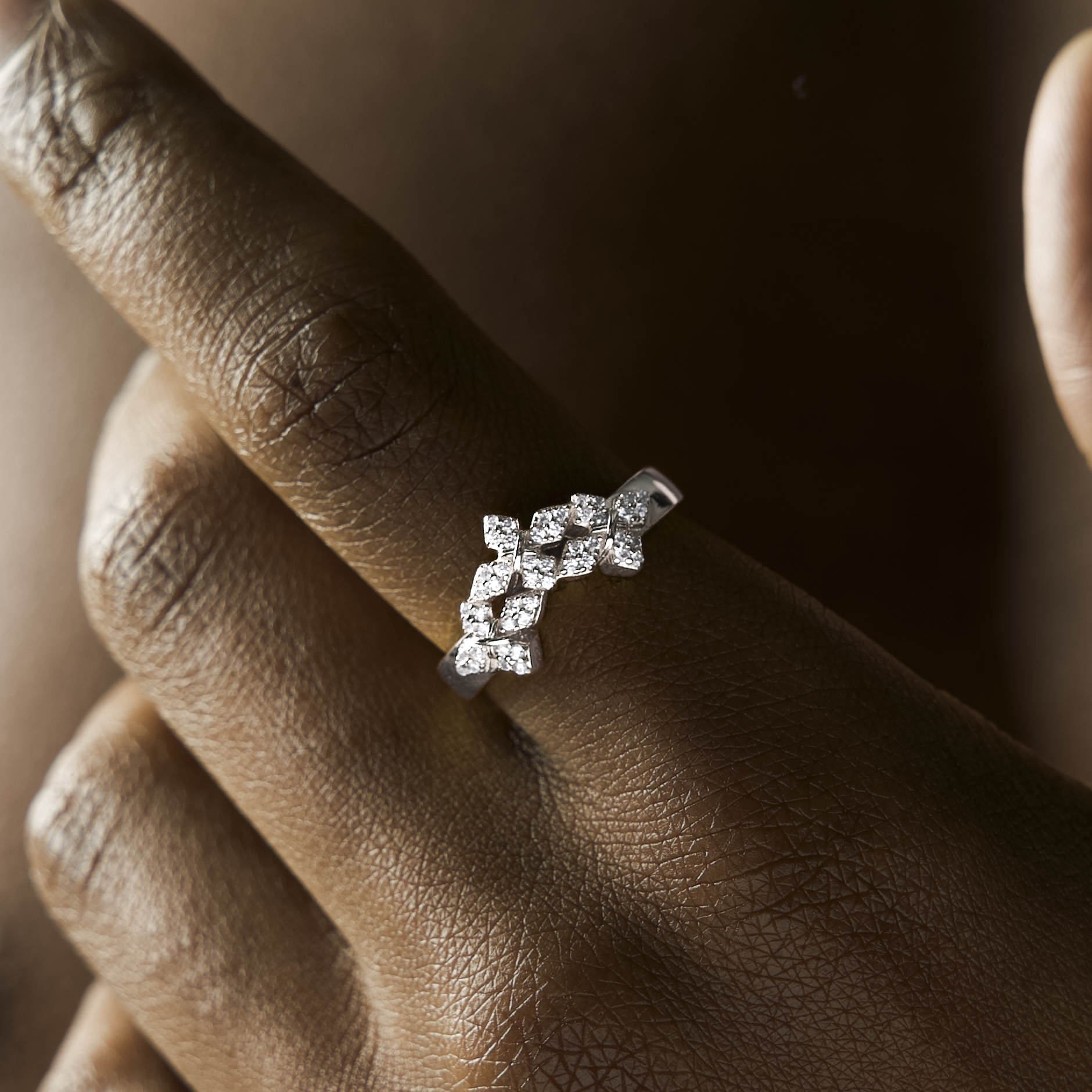 The Iced Triple Crossed Star Ring embodies the central symbol of the Destiny collection: the starry cross.