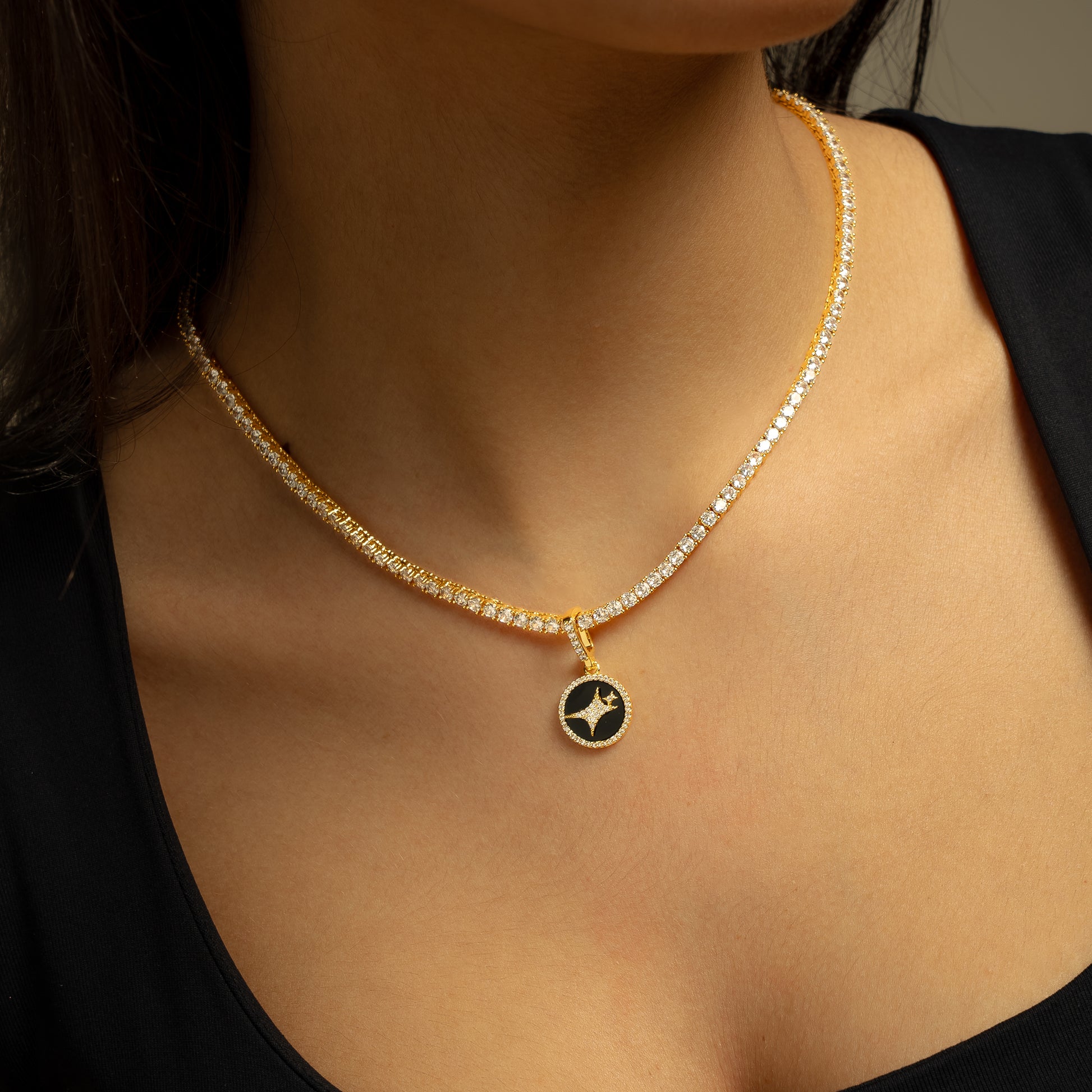 Discover our Signature Medallion, a radiant piece of jewelry that enhances our iconic star logo. With a diameter of 1.5 cm, this refined pendant is adorned with onyx imitation stone and sparkling cubic zirconia, highlighting our central star. Perfect for adding a touch of sophistication and brilliance to your outfits.