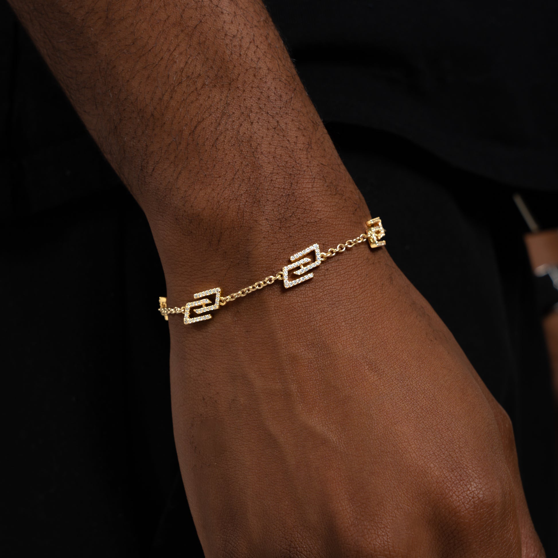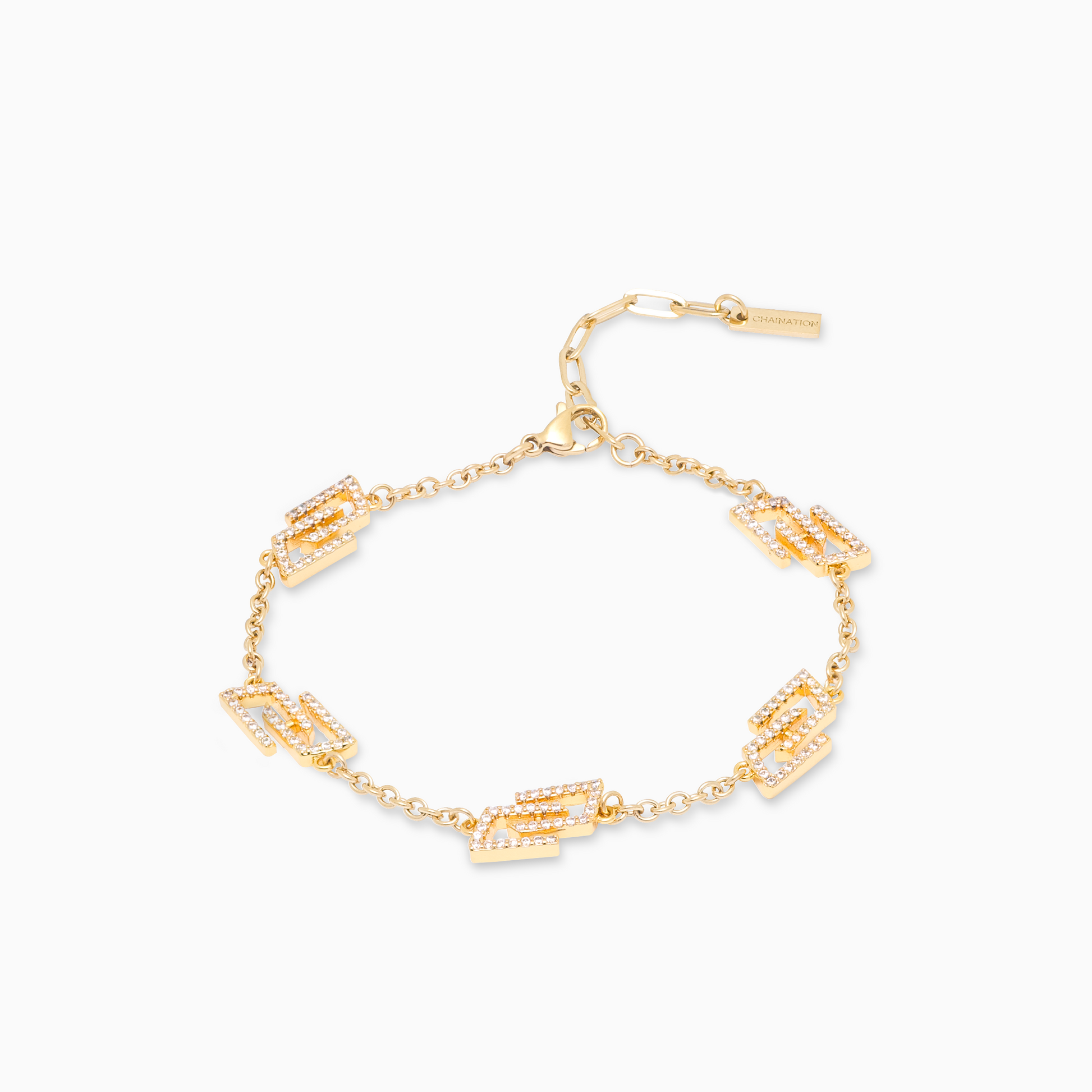 Here is our Monogram Bracelet, a refined and remarkable piece. Each of our brand's five monograms, integrated into a 3mm cable chain, is delicately adorned with sparkling stones. Precisely crafted, this bracelet captures the essence of our brand with sophistication and style.