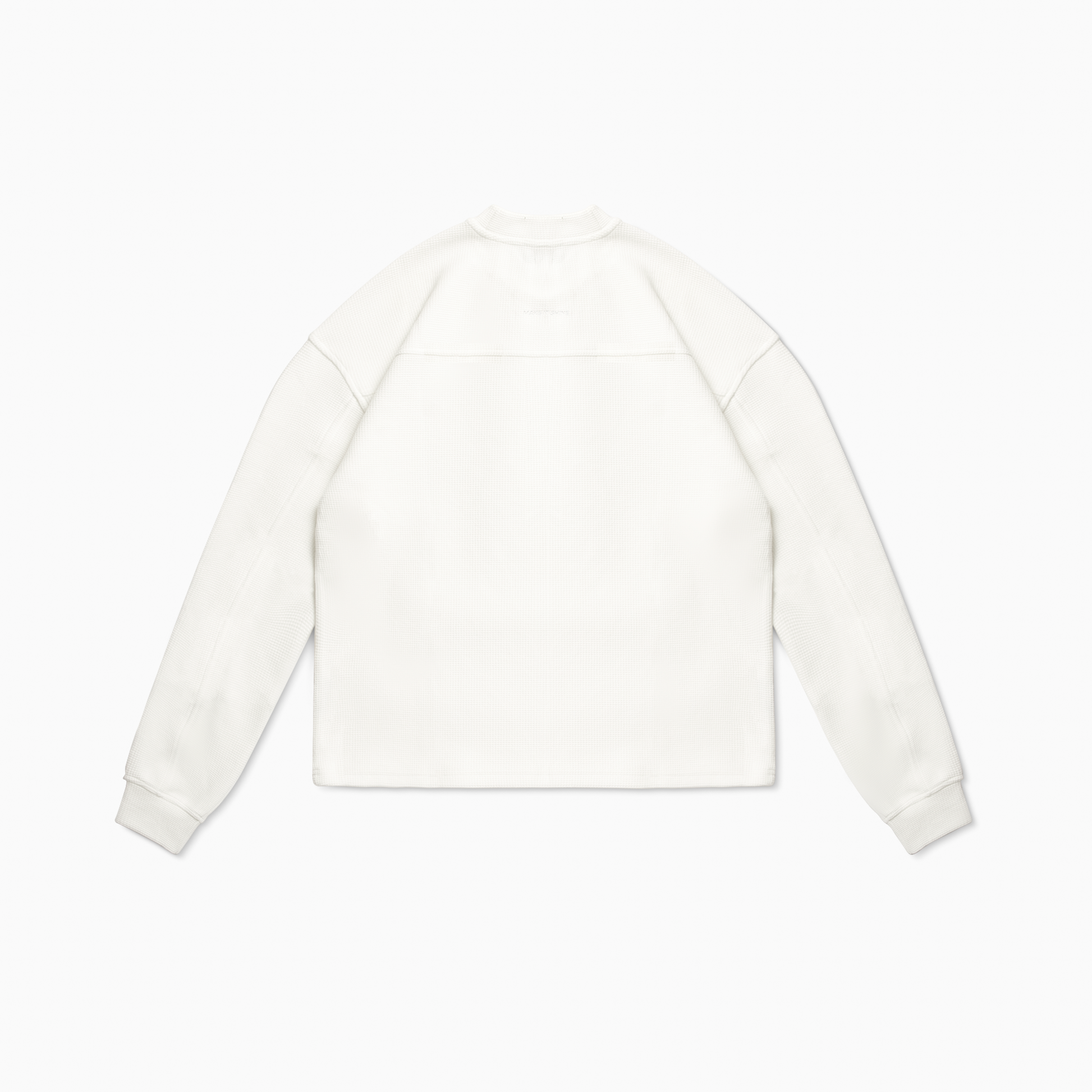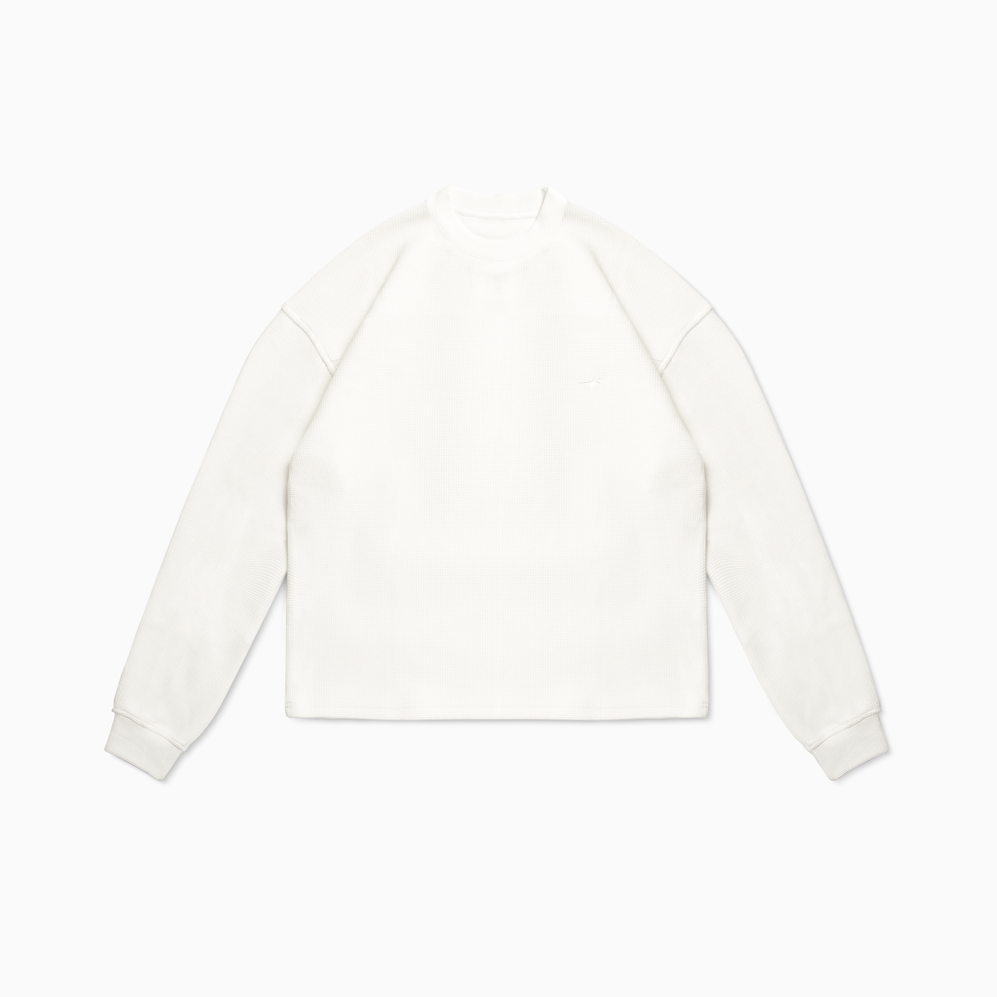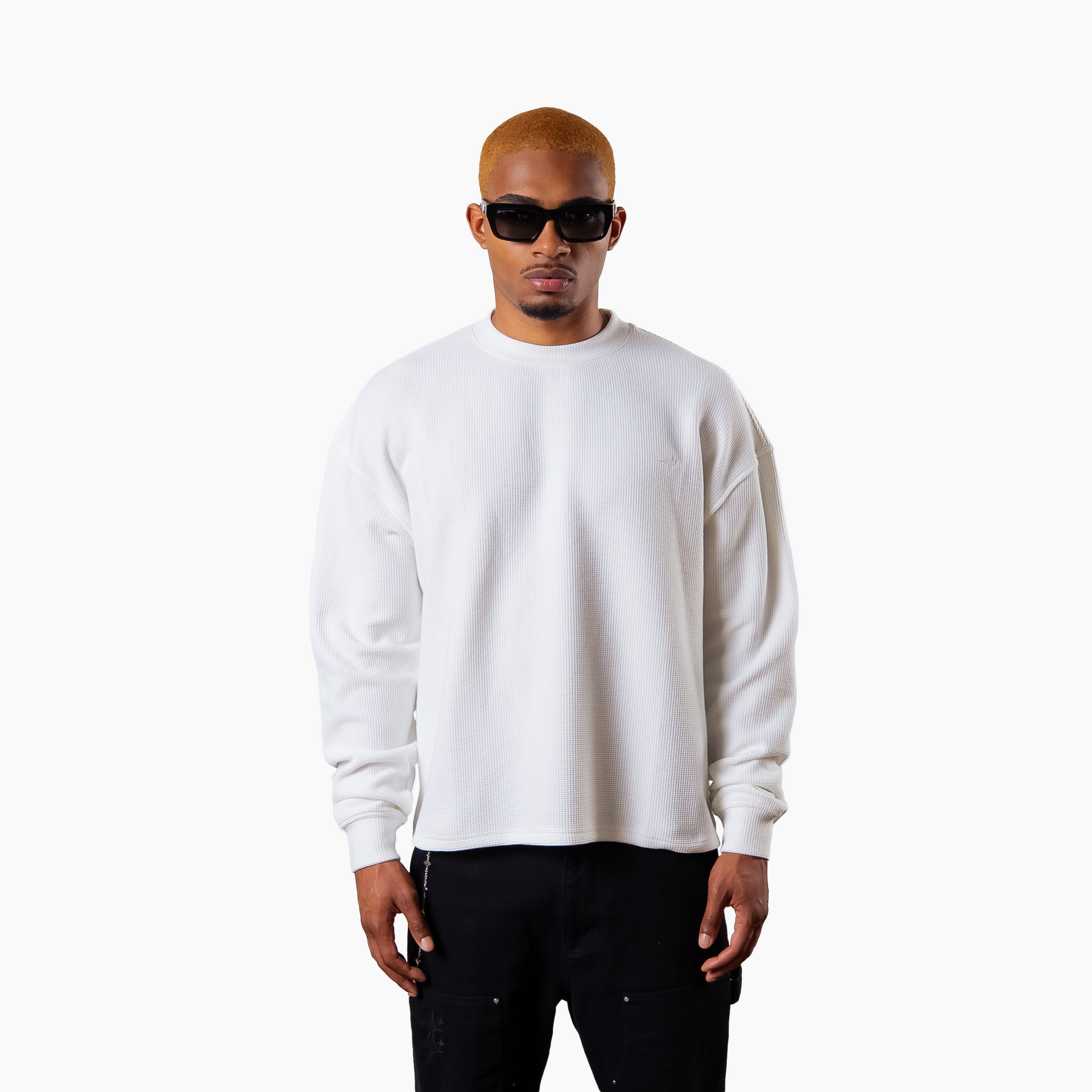 Off-white long-sleeved Waffle Sweater with an oversized, boxy fit, made from premium heavyweight cotton. Cinched cuffs. Crew neck.
