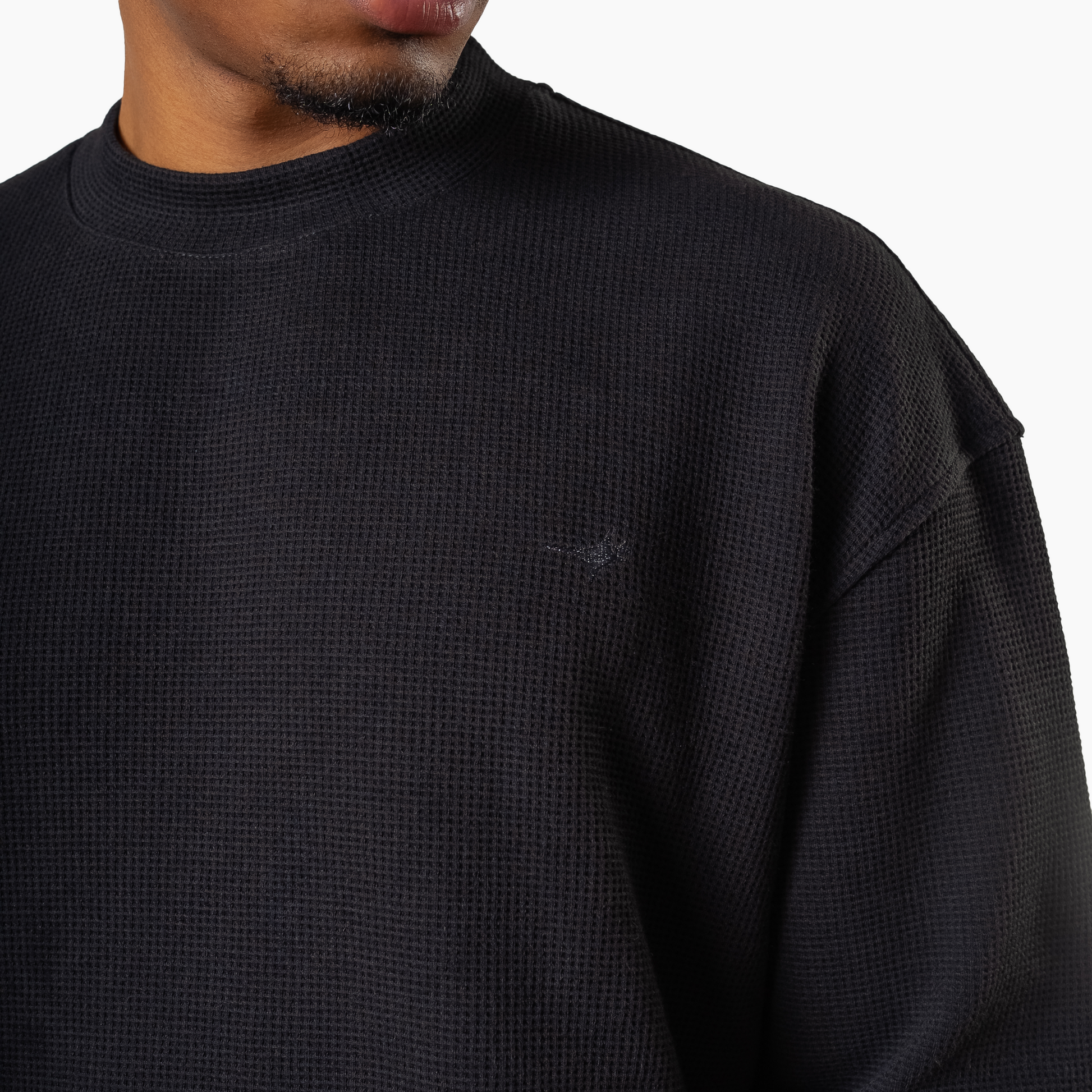 Black long-sleeved Waffle Sweater with an oversized, boxy fit, made from premium heavyweight cotton. Cuffed cuffs. Crew neck.