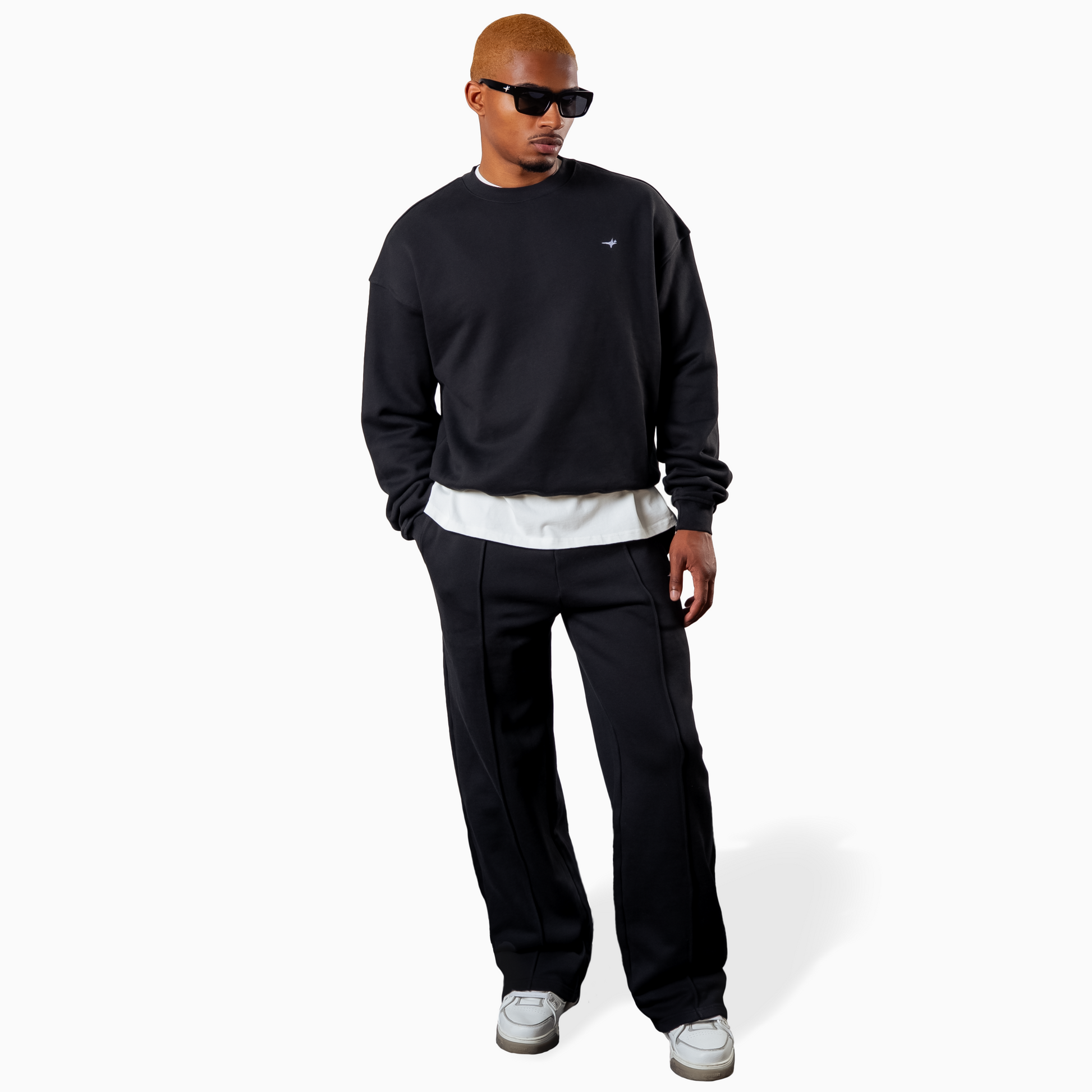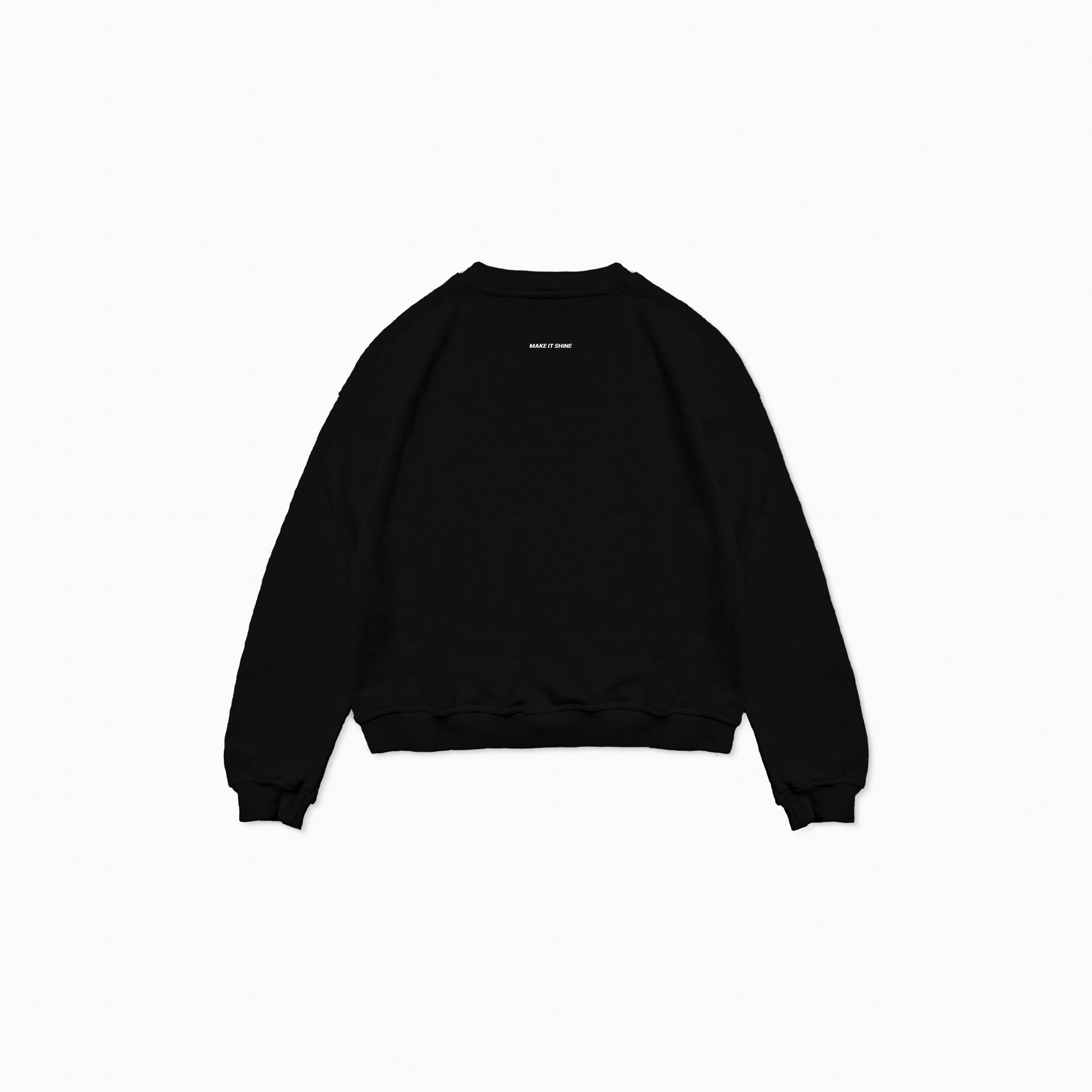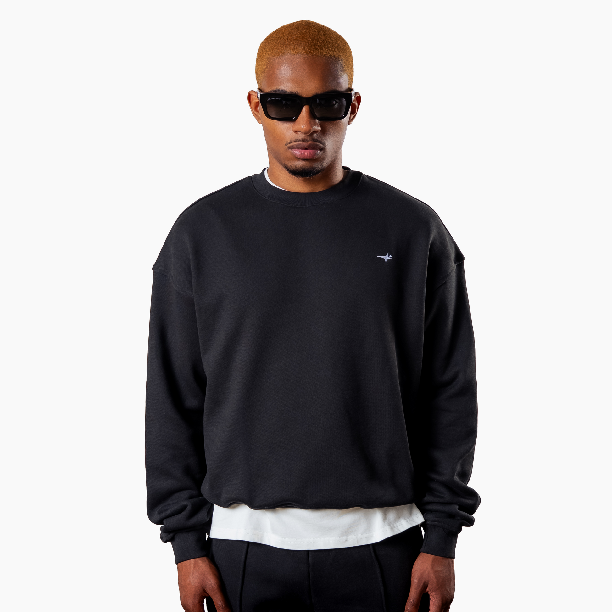 Black long-sleeved jersey sweater with an oversized fit, made from premium heavyweight cotton. Ribbed crew neck.